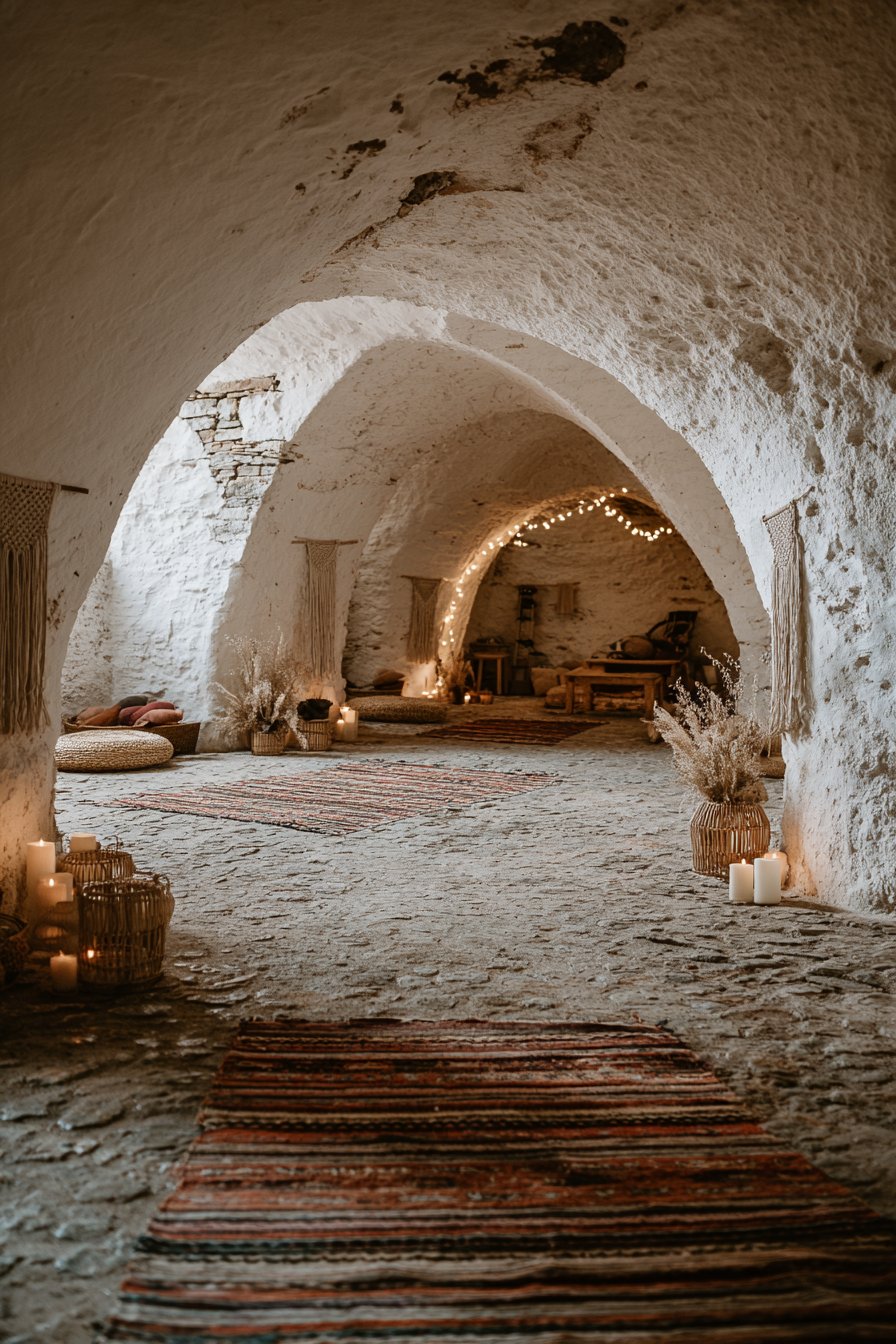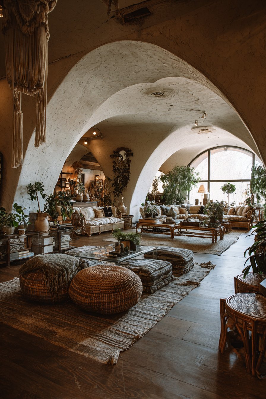 Beyond the arch, the living space features layered textiles in warm earth tones—a vintage rug over sisal matting, throw pillows in varying patterns and textures, and a chunky knit throw draped over rattan furniture. String lights carefully arranged along the arch’s edge create magical evening ambiance, their warm glow bouncing off the textured plaster and creating an inviting, cozy atmosphere perfect for intimate gatherings. The overall effect is collected and lived-in rather than carefully coordinated, which is exactly the point of bohemian design—creating spaces that feel personal and evolved over time.