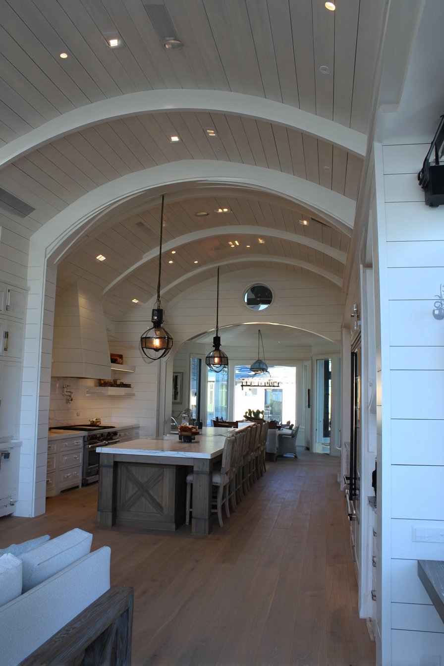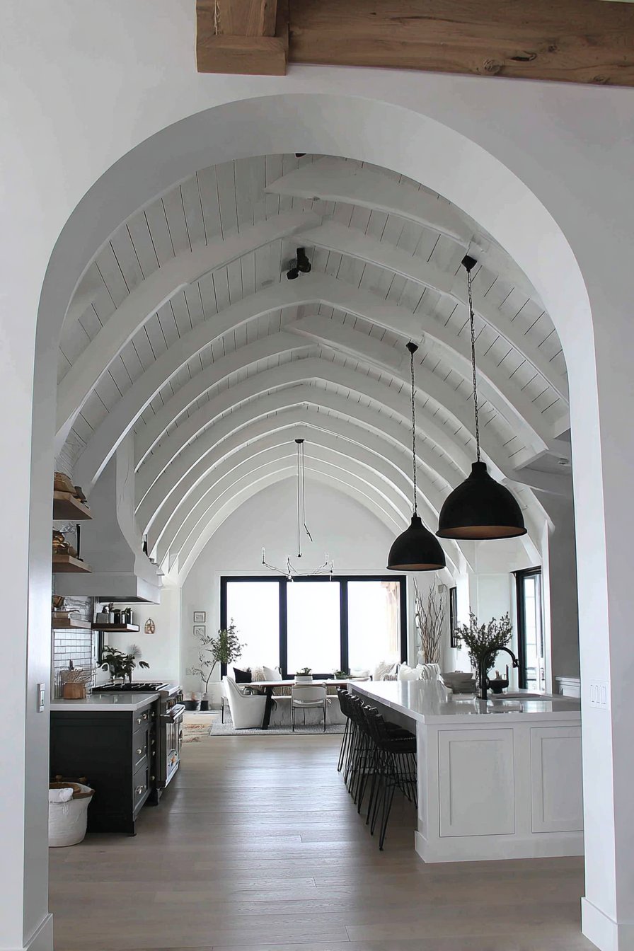 Modern farmhouse wall arches decor ideas successfully bridge the gap between rustic charm and contemporary clean lines, as seen in this kitchen featuring a grand arched opening between kitchen and dining areas. The arch incorporates shiplap detail within its curve, creating textural interest and reinforcing the farmhouse aesthetic without resorting to overly rustic or country elements. The crisp white paint covering both the arch and shiplap panels keeps the look fresh and modern, while the natural wood beam accent running horizontally at the arch’s base adds warmth and prevents the space from feeling too crisp or clinical.