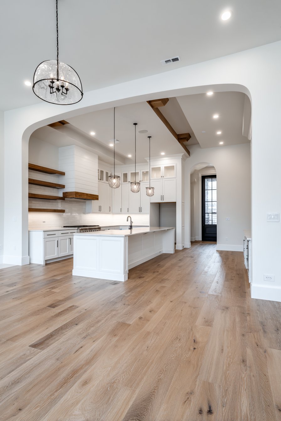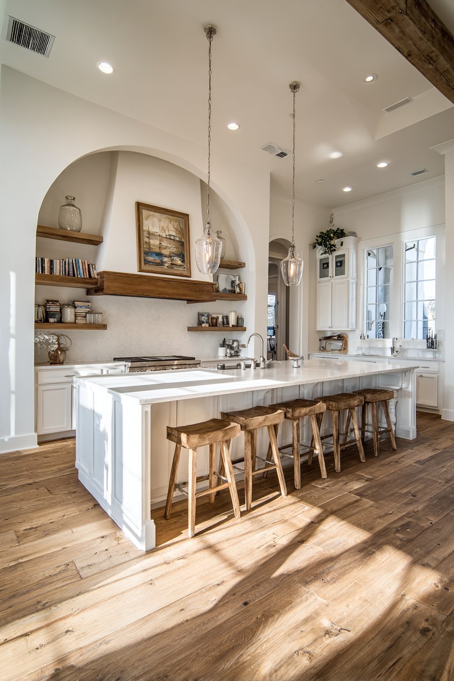 The arch’s generous proportions suit the farmhouse style, which traditionally features substantial, honest architectural elements rather than delicate or ornate features. This opening allows easy flow between food preparation and dining areas while maintaining some definition between the spaces—a practical consideration for those who want open concept living without entirely eliminating zones. Through the arch, you glimpse open shelving with integrated lighting displaying white dishware and glass jars, modern pendant lights with black metal shades hanging over a large island, and subway tile backsplash that reinforces the clean, classic aesthetic.