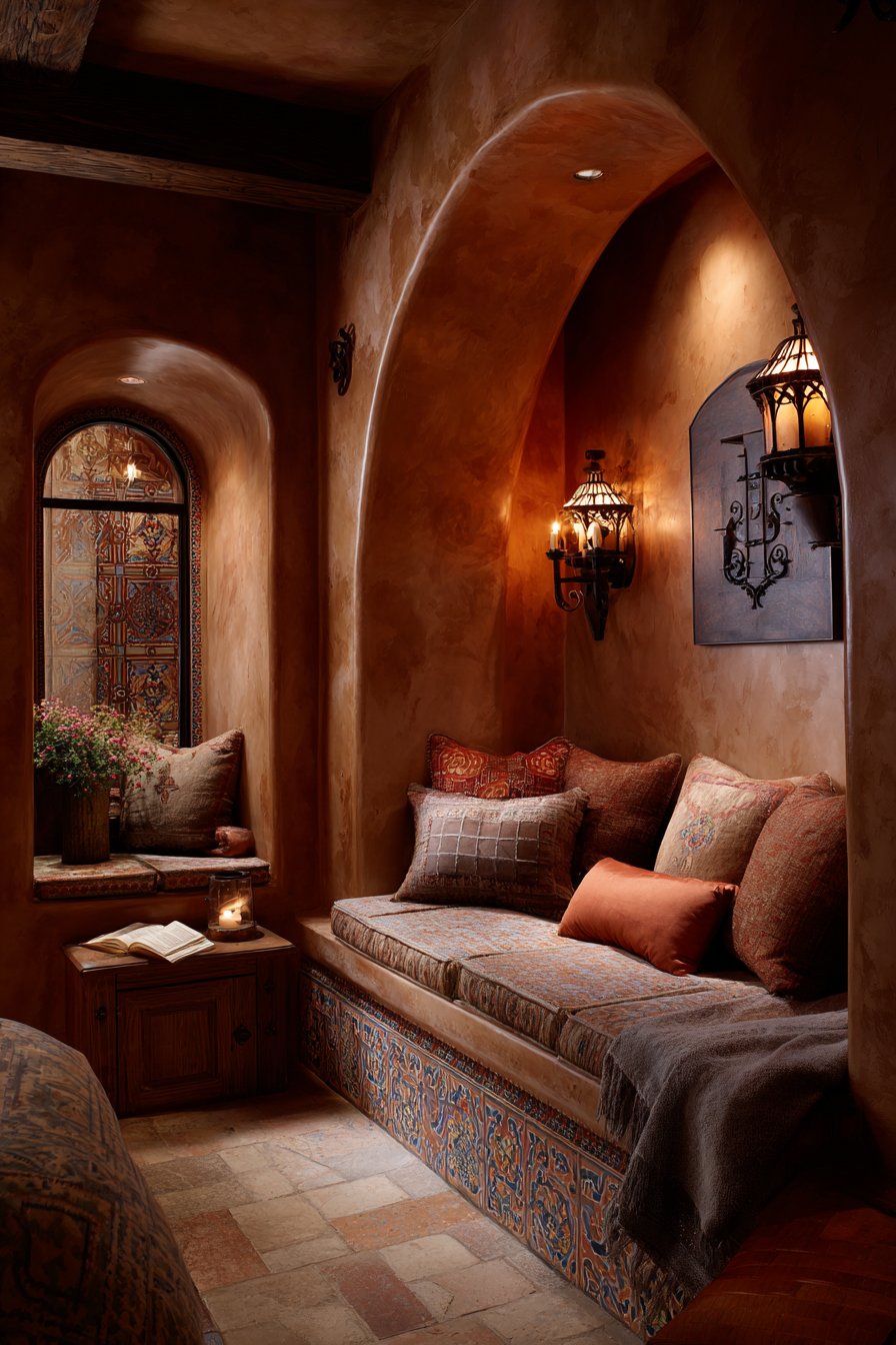 Colorful Spanish tiles in traditional patterns—perhaps in blues, yellows, and greens—accent the space, installed either as a narrow border around the arch opening or as decorative inserts within the alcove walls. These hand-painted tiles add cultural authenticity and visual richness without overwhelming the space. A small side table holds a reading lamp, current book, and perhaps a cup of tea, making the nook fully functional. The combination of robust architecture, rich colors, and layered textiles creates a space that feels collected and meaningful rather than merely decorated.