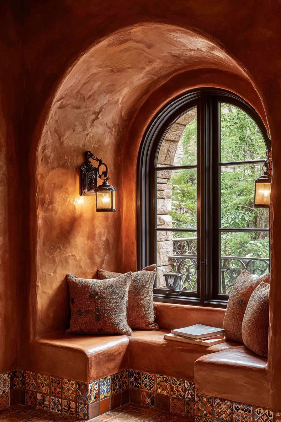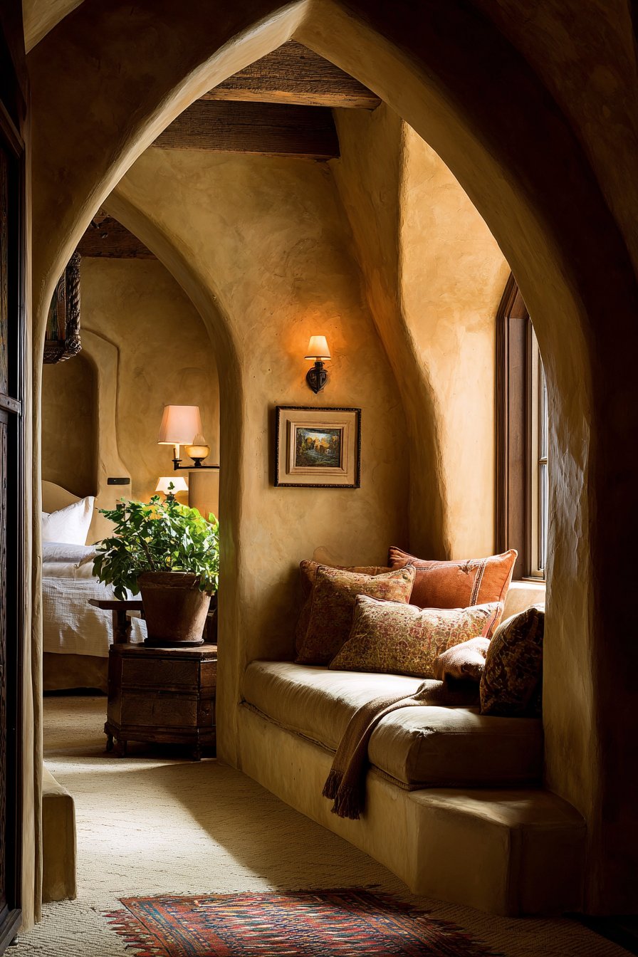 Spanish Colonial wall arches decor ideas transform functional spaces into romantic retreats, as demonstrated by this bedroom featuring a decorative arched alcove creating a cozy reading nook built into the wall. The arch displays thick plaster walls with deliberately visible texture in warm terracotta tones, immediately evoking the sun-baked architecture of Spanish missions and haciendas. This isn’t the smooth, refined plaster of contemporary design but rather a robust, hand-worked surface showing trowel marks and natural variation that speaks to traditional building methods and craftsmanship.