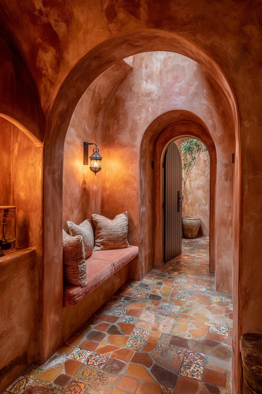 Moroccan wall arches decor ideas bring exotic elegance and rich cultural heritage into your home, nowhere more dramatically than in an entryway featuring an ornate pointed arch doorway. This design showcases intricate carved plaster details arranged in geometric patterns that speak to centuries of Islamic artistic tradition. The arch rises to a distinctive point at its apex, creating that characteristic Moroccan profile that immediately signals visitors they’re entering a space of beauty and intention. The deep terracotta base color is enriched with gold accent details that catch natural light streaming through the entrance, creating sparkle and visual richness.