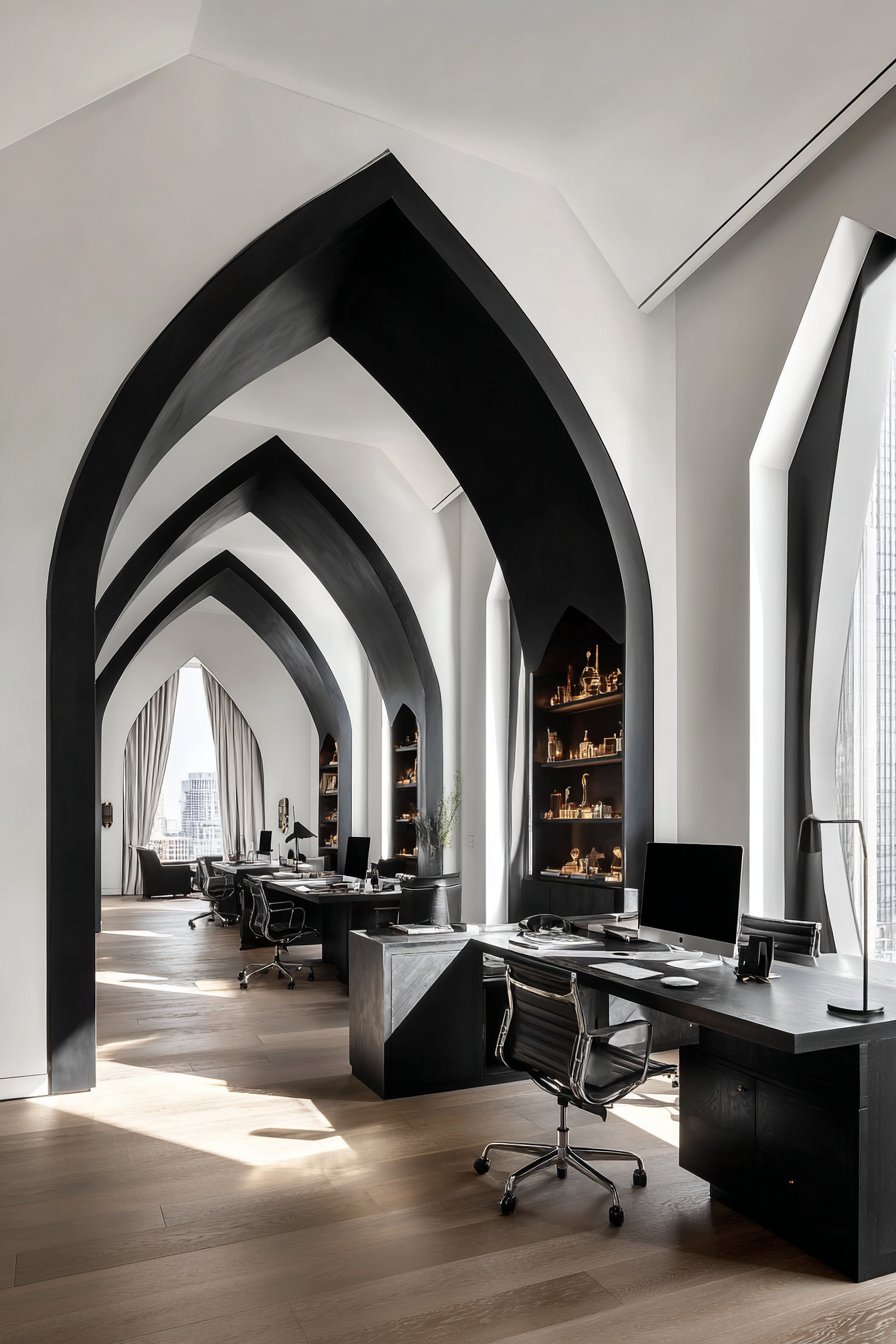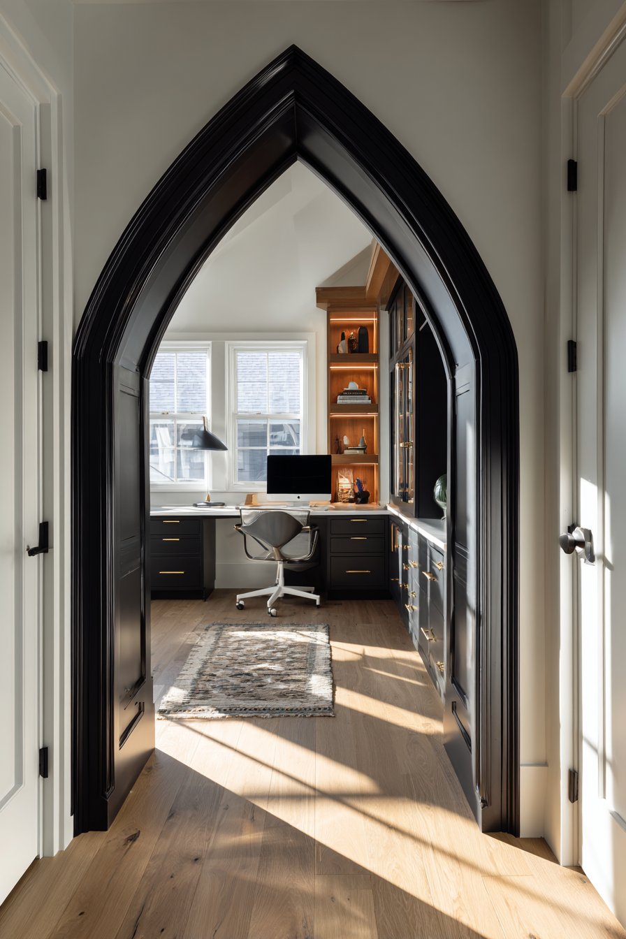 Bold contemporary wall arches decor ideas prove that dramatic contrast can elevate an entire space, as seen in this home office featuring a modern pointed arch doorway in matte black painted finish creating striking impact against crisp white walls. This design choice represents a departure from traditional arch treatments, using color rather than ornament to make the architectural element unforgettable. The matte black finish absorbs light rather than reflecting it, creating a deep, velvety appearance that reads as solid and substantial. The pointed Gothic-inspired arch shape adds to the drama, its sharp apex drawing the eye upward and creating dynamic geometry.