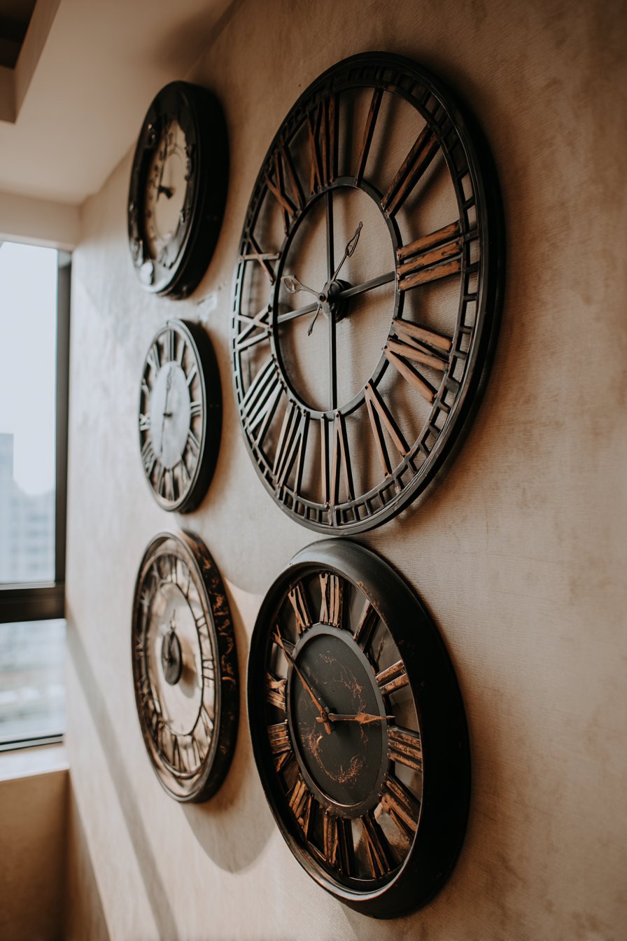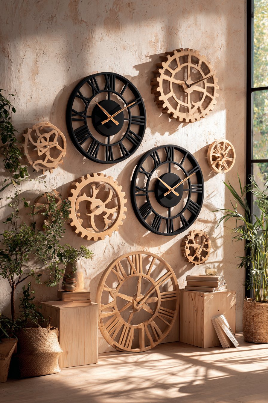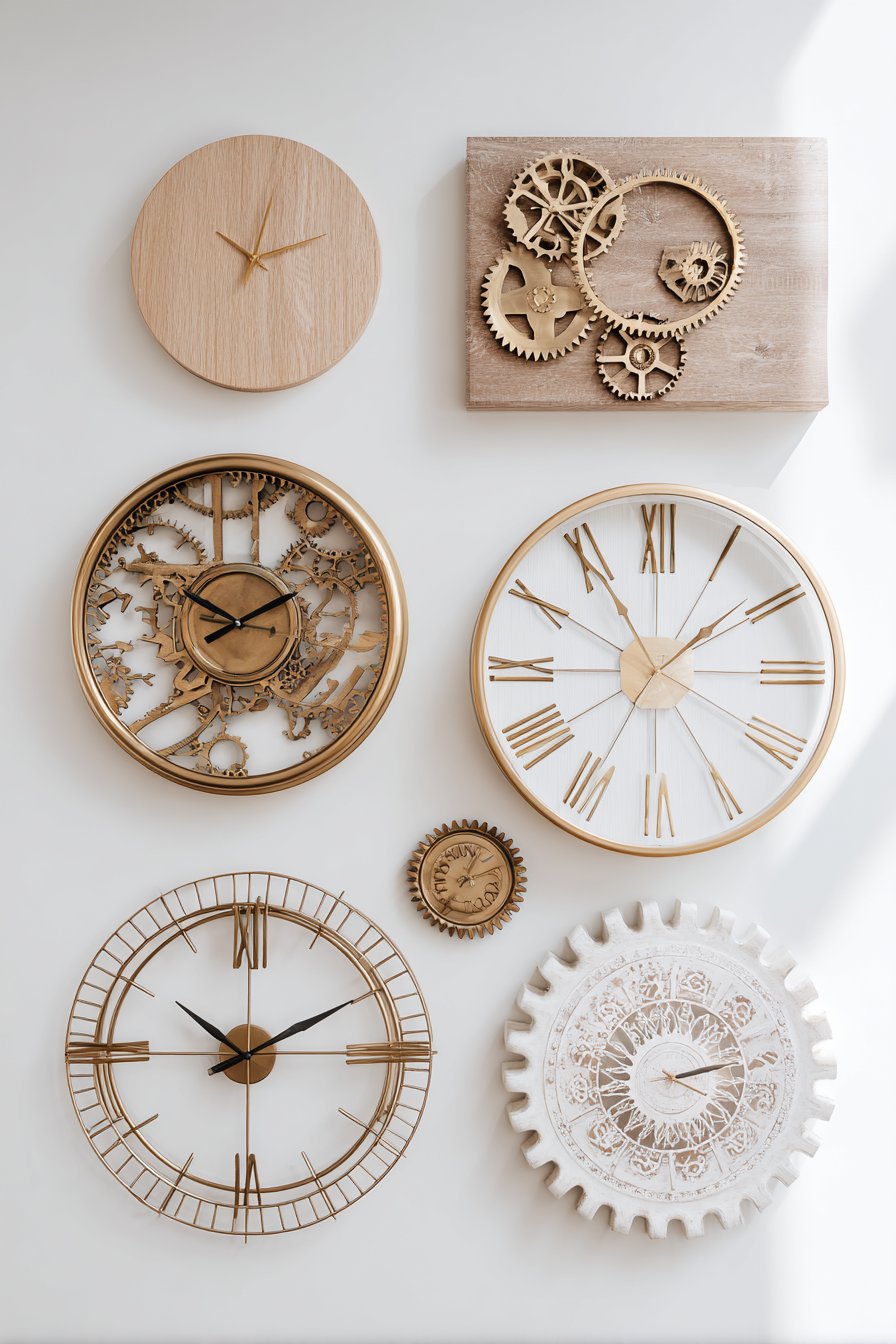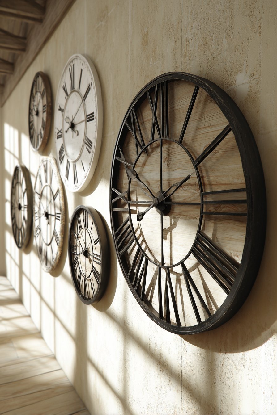 The gallery wall concept extends beyond framed art to embrace functional objects, as demonstrated by this creative arrangement combining five coordinating wall clocks in varying sizes from 8 to 20 inches. Each clock features complementary black, white, and natural wood finishes that create visual cohesion while individual design variations maintain interest. This artistic clock collection transforms timekeeping into a dynamic focal point that’s far more engaging than a single large clock could ever be. The arrangement demonstrates how multiples of similar objects can create impact greater than the sum of their parts.
