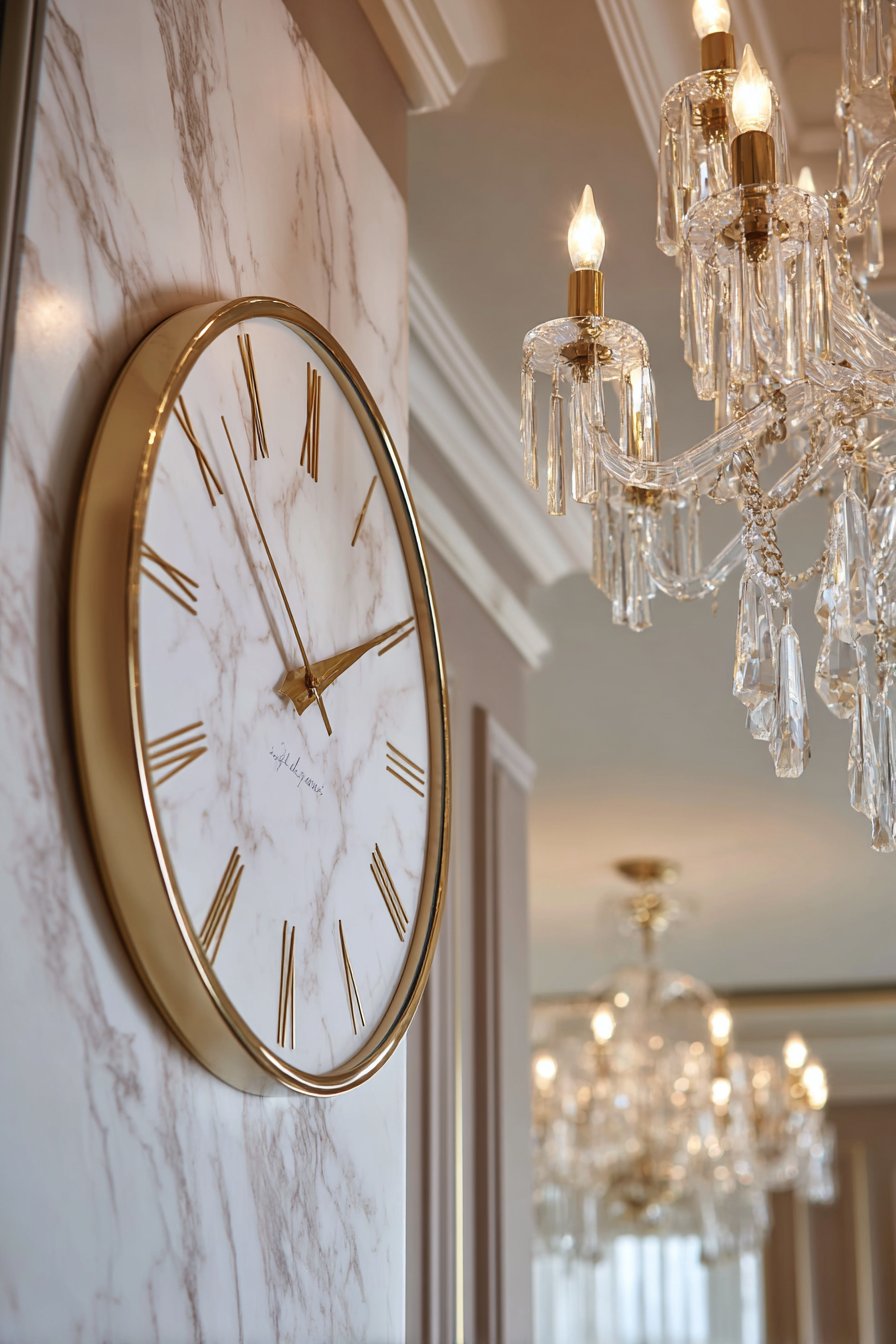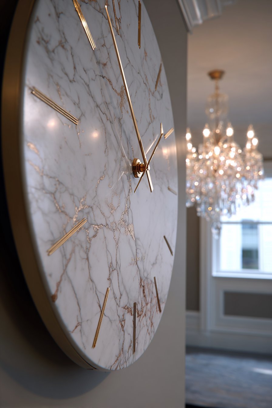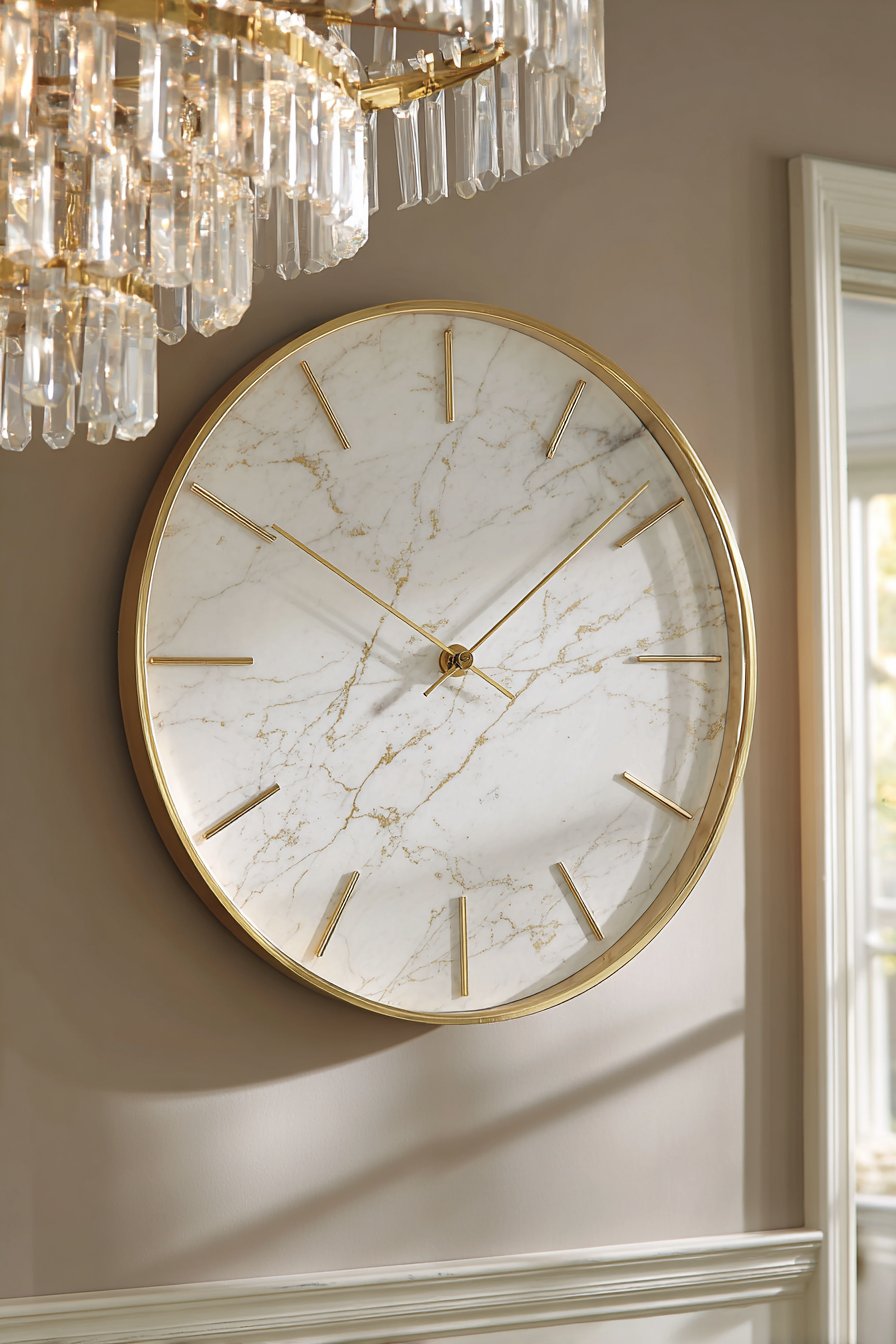 Luxury reveals itself through premium materials and refined execution, as evidenced by this elegant wall clock featuring white Carrara marble and gold leaf details. The 18-inch timepiece showcases a genuine marble clock face with distinctive gray veining that makes each piece unique—no two marble clocks are identical, ensuring exclusivity. Delicate gold leaf hour markers and matching gold hands introduce warmth and precious metal elegance without overwhelming the marble’s natural beauty. A thin brass frame provides definition while maintaining the design’s overall delicacy and sophistication.