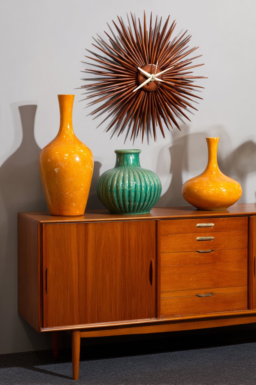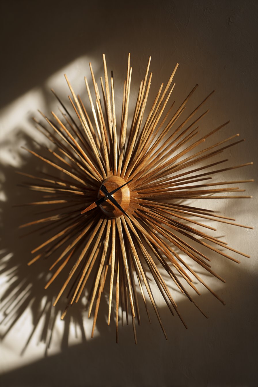 The asymmetrical design reflects contemporary art’s embrace of unconventional balance and unexpected relationships between forms. Rather than the predictable circular arrangement of traditional clocks, this piece distributes visual weight in surprising ways that feel fresh and modern. The off-center mechanism placement might initially seem impractical, but it actually reinforces the artistic nature of the design, reminding viewers that this object exists at the intersection of art and utility. Mid-century modern furniture nearby complements the clock’s artistic ambitions while grounding the space in approachable comfort.