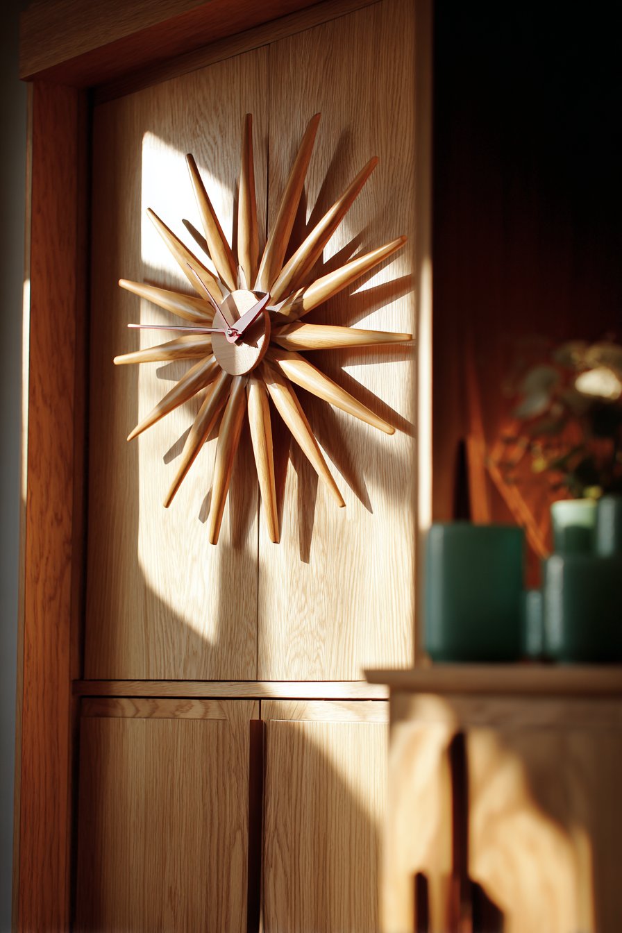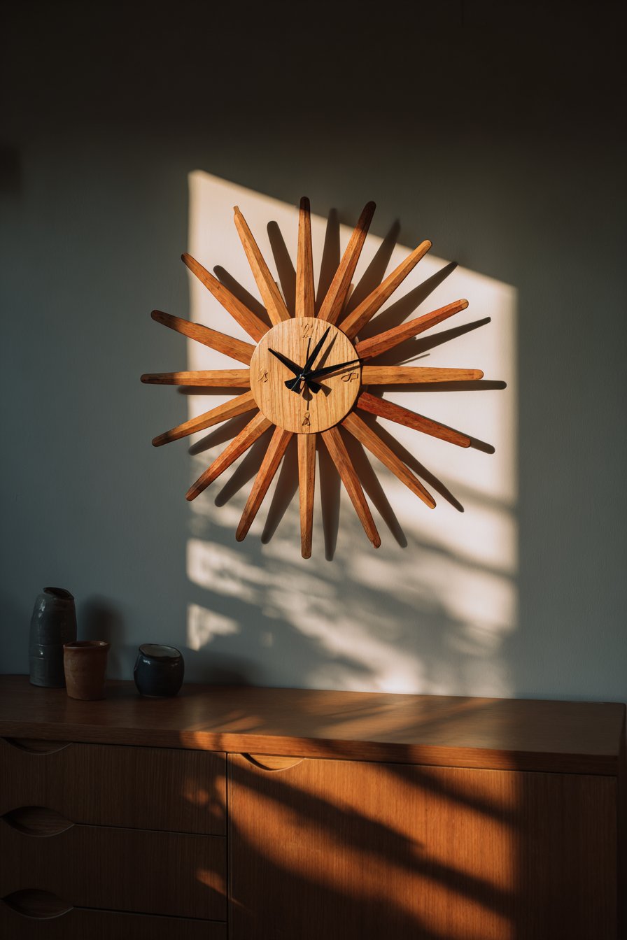 • Balance bold geometric clocks with softer textures like fabric and wood elsewhere in the room