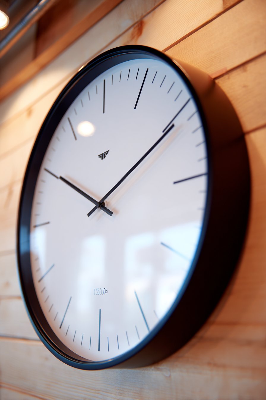 • Select oversized clocks (30+ inches) for industrial spaces with high ceilings and large wall expanses