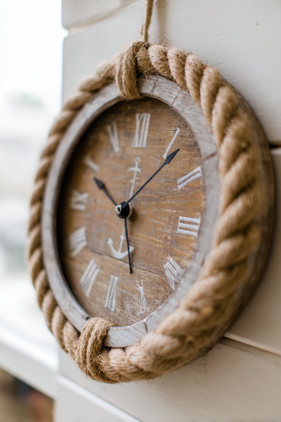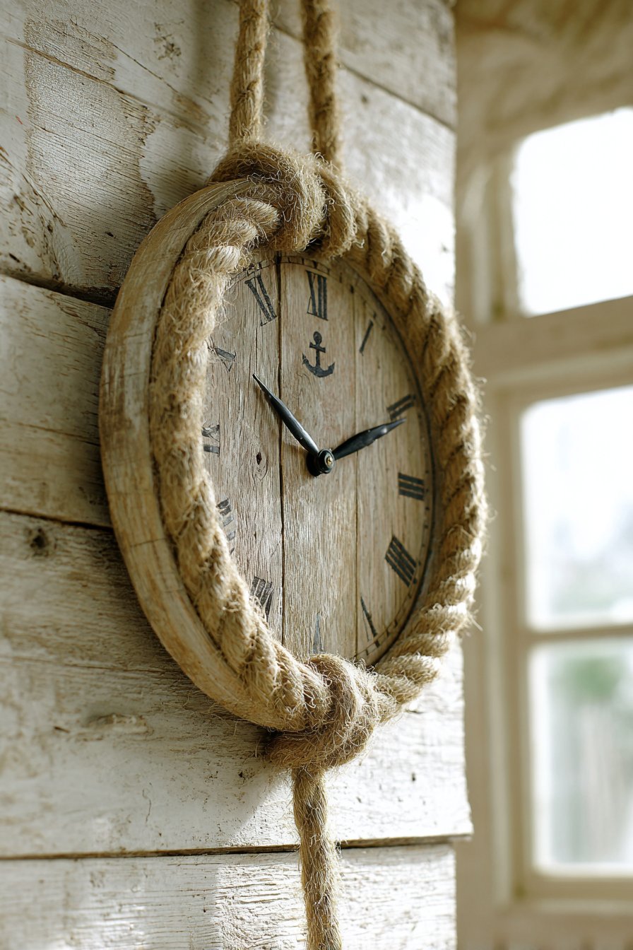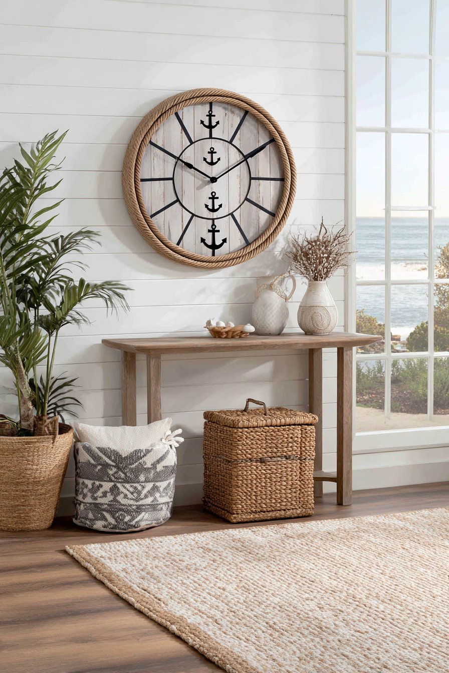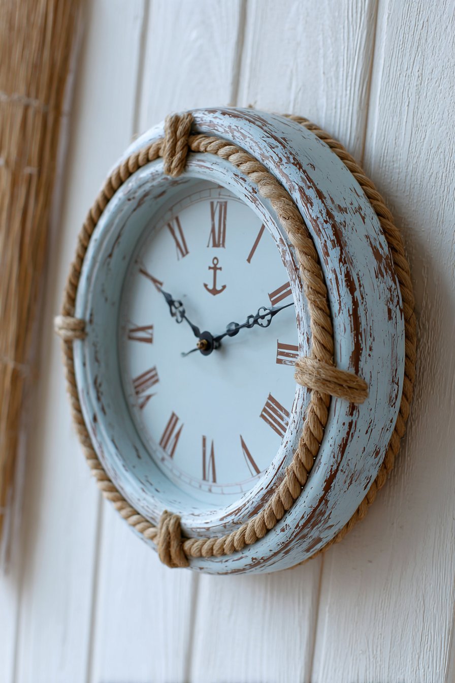The weathered wood finish suggests pieces found in beachcombing adventures or salvaged from old boats—romantic narratives that enhance the clock’s appeal beyond pure aesthetics. The rope wrapping serves both decorative and structural purposes, concealing frame edges while adding substantial tactile interest. Unlike printed or painted rope imitations, genuine rope applications create authentic texture that ages beautifully over time. The anchor motifs remain subtle enough to avoid kitsch while clearly communicating the clock’s coastal inspiration.