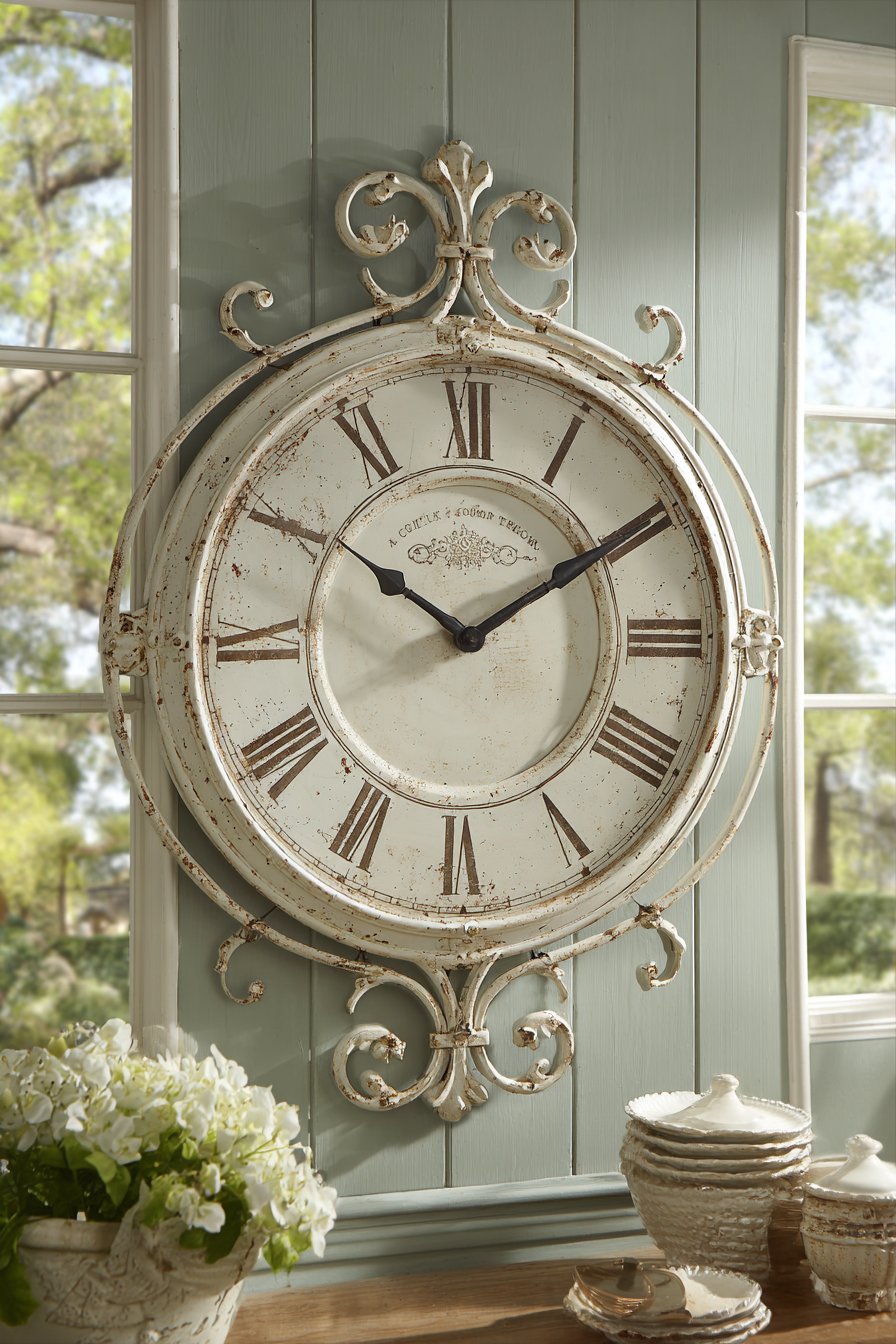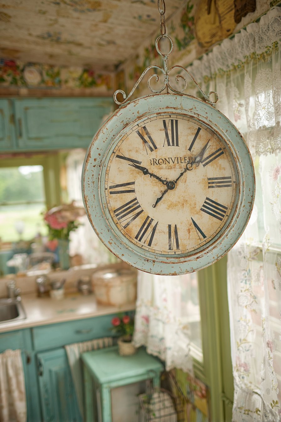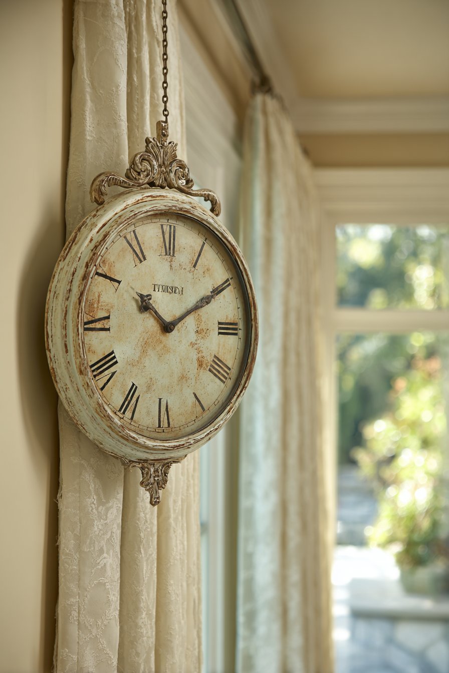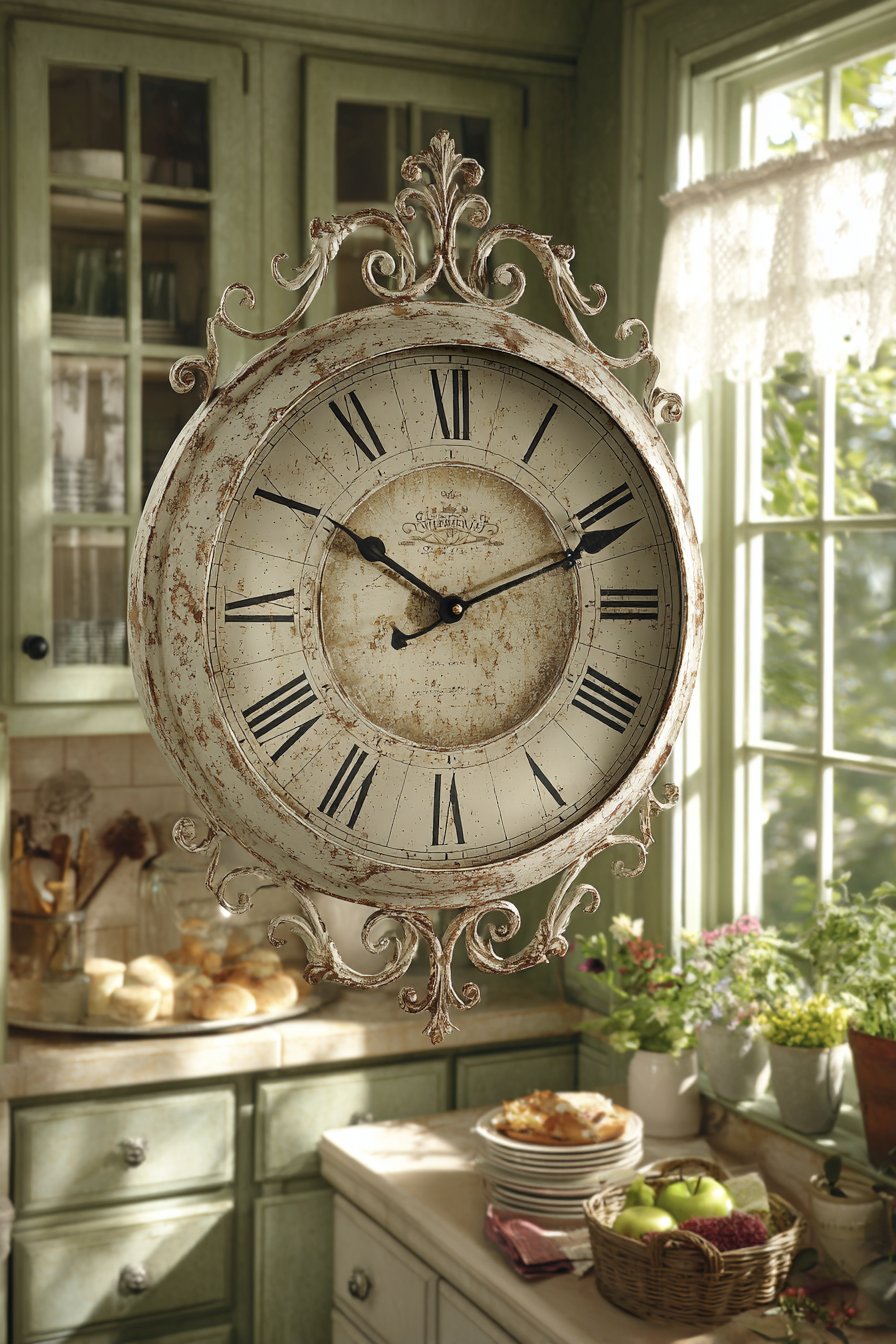 Hanging in a Provence-inspired kitchen with soft sage green cabinets and natural light streaming through lace curtains, this clock becomes the jewel in a carefully curated European-inspired setting. Interior photography emphasizes the romantic vintage aesthetic and weathered charm, capturing how soft light plays across the distressed finish. The cream color coordinates beautifully with sage green cabinetry while the Roman numerals add formal elegance to a kitchen setting. Lace curtains filter sunlight, creating the soft, diffused illumination characteristic of French interiors.