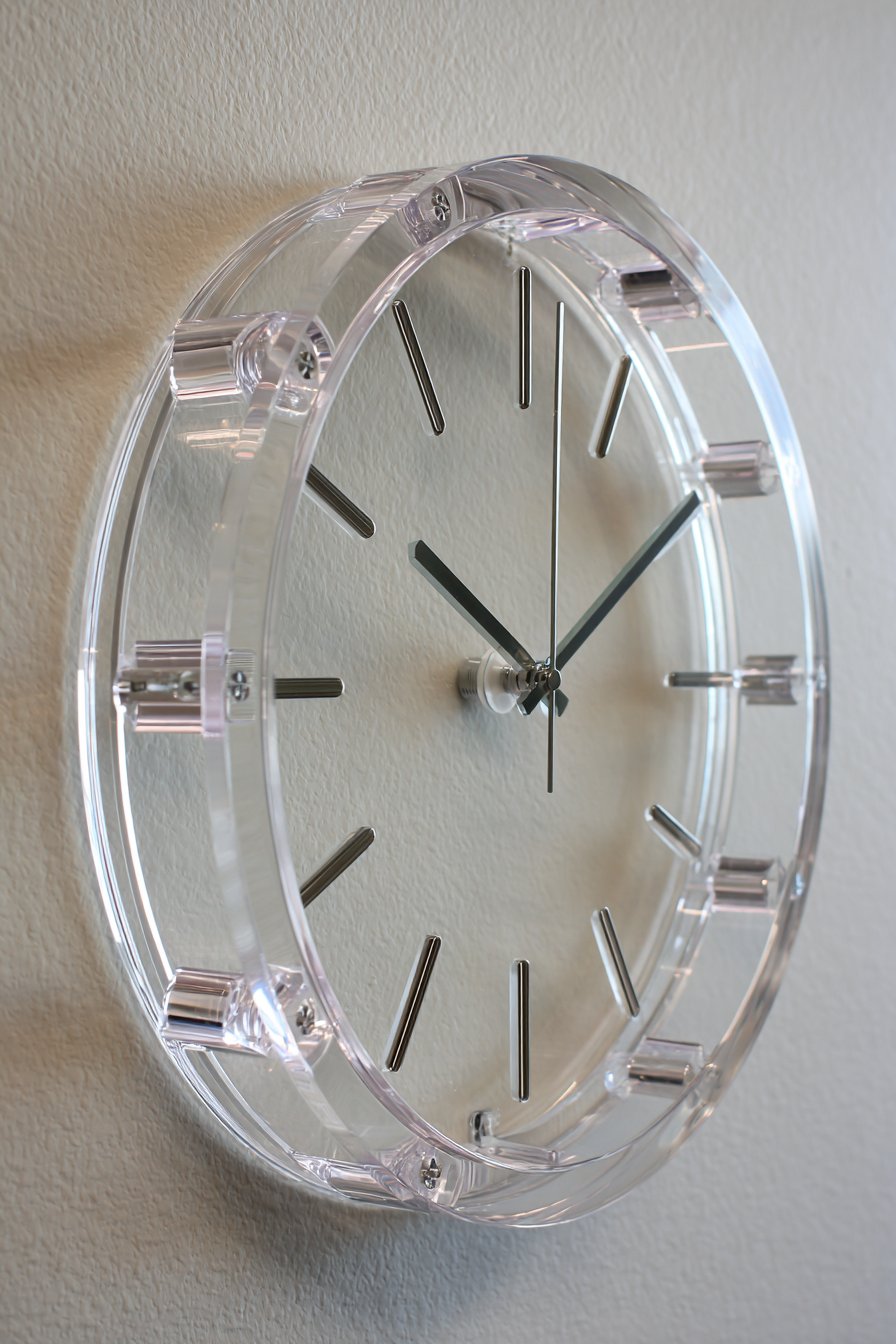 Innovation in materials opens new design possibilities, demonstrated by this modern acrylic transparent wall clock that seems to float on the wall. The 16-inch contemporary piece features clear acrylic construction with metallic silver internal mechanisms visible through the material, creating an x-ray effect that reveals rather than conceals the clock’s functional components. Minimalist hands and subtle hour dots maintain clean aesthetics while the transparent construction creates visual lightness. This see-through design brings an almost magical quality to a typically solid object.