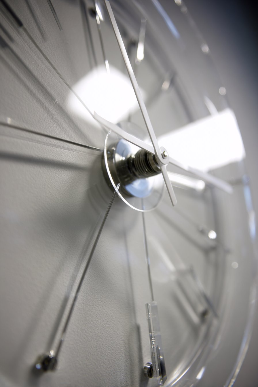 Mounted on a white wall in a minimalist apartment, the transparent clock creates visual interest without adding visual weight—a crucial distinction in spaces where airiness and openness matter. Professional photography with backlighting highlights the transparent qualities and innovative design, demonstrating how light passes through the acrylic and interacts with the visible mechanisms. The clock’s ability to let wall color show through makes it remarkably versatile, as it adapts to different backgrounds while maintaining its distinctive character.