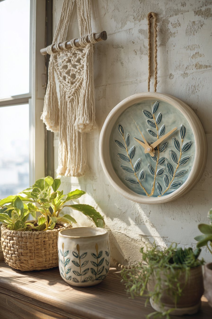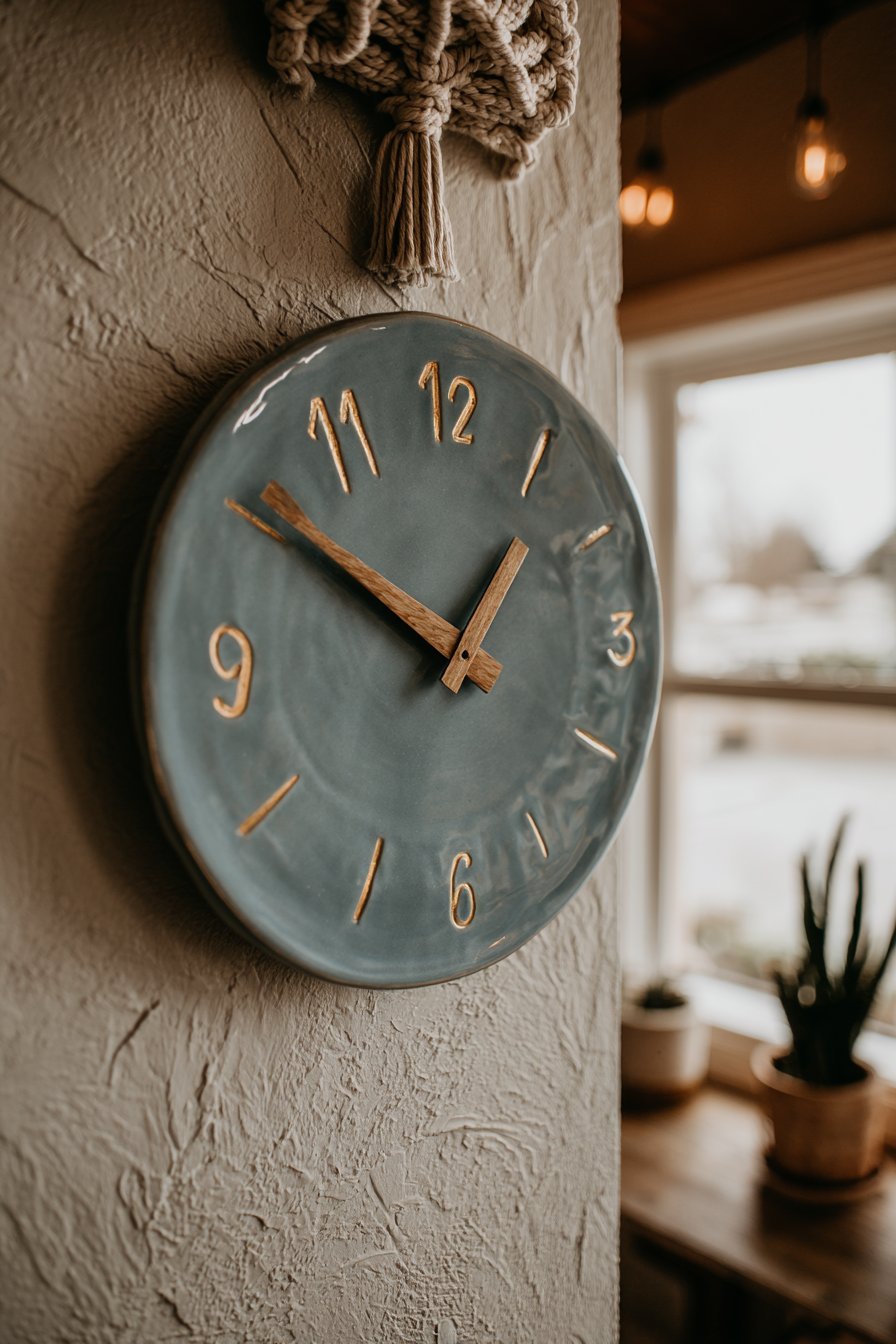 Positioned in a bohemian-style bedroom on a textured wall with macramé and plants nearby, this handcrafted clock reinforces the space’s artisanal narrative. Natural window light emphasizes the ceramic texture and artistic details, highlighting how glaze pools slightly thicker in recessed areas while flowing thinner on raised surfaces. These variations aren’t defects—they’re evidence of handcraft and the ceramic firing process that makes each piece unique. The soft gray-blue glaze creates calming color that enhances bedroom tranquility while gold accents add precious metal elegance.