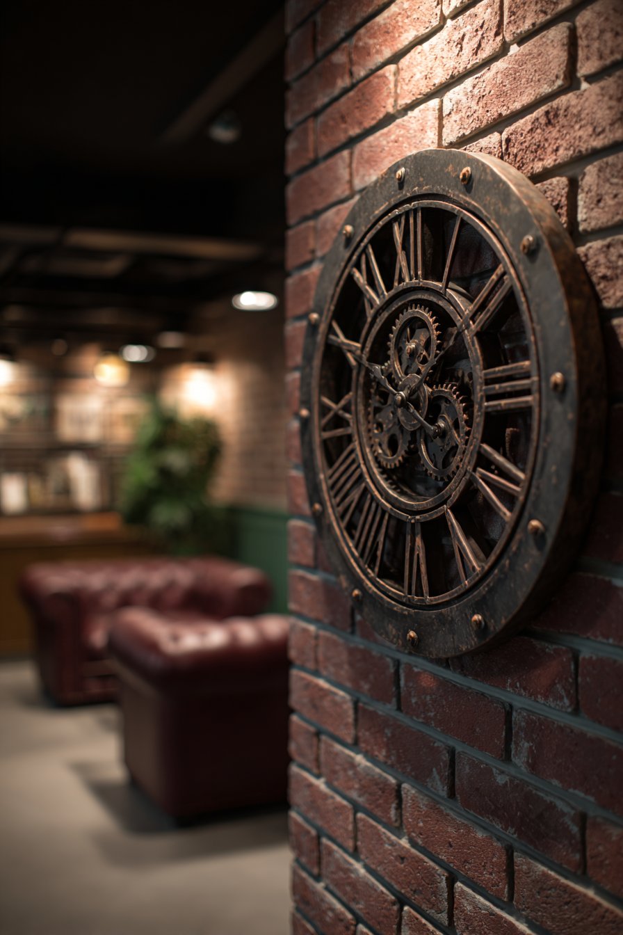 Mounted against an exposed brick wall in a loft apartment, this timepiece finds its perfect context. The rough texture of century-old brick provides an ideal backdrop for the metallic finish, while nearby leather furniture adds layers of complementary textures that enhance the industrial narrative. The visible gears aren’t just decorative elements; they reference the inner workings of actual clock mechanisms, creating visual interest and inviting closer examination. Professional interior photography with warm ambient lighting emphasizes these mechanical details, casting dramatic shadows that heighten the three-dimensional quality of the piece.