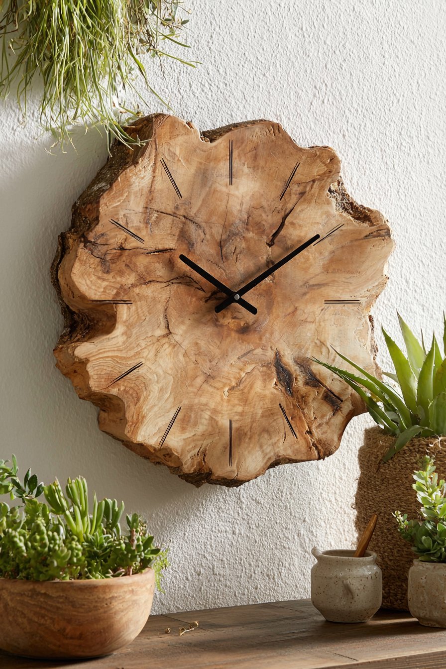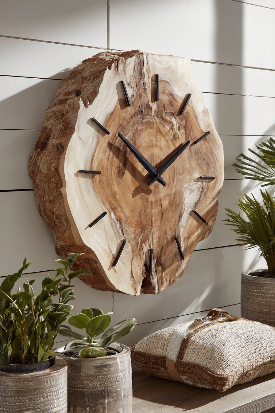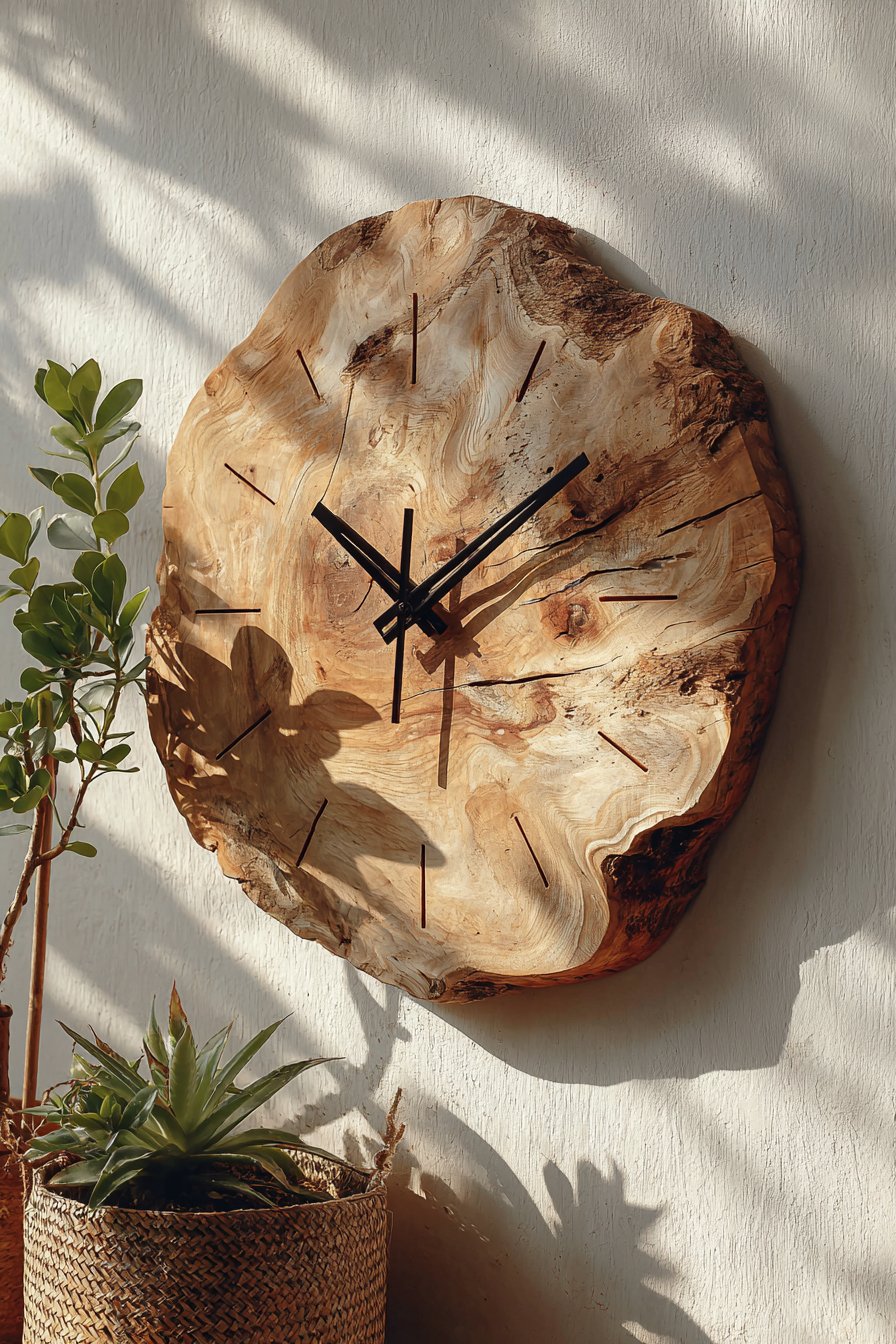 Mounted on white walls in a modern farmhouse setting with potted plants and natural textures nearby, this clock creates a stunning focal point. Soft natural lighting emphasizes the unique wood characteristics and organic aesthetic, highlighting grain patterns, natural color variations, and the textural contrast between smooth wood surface and rough bark edge. Each live-edge clock is genuinely one-of-a-kind since no two tree cross-sections share identical shape or grain pattern. The white wall provides clean backdrop that allows the wood’s natural beauty to shine without visual competition.
