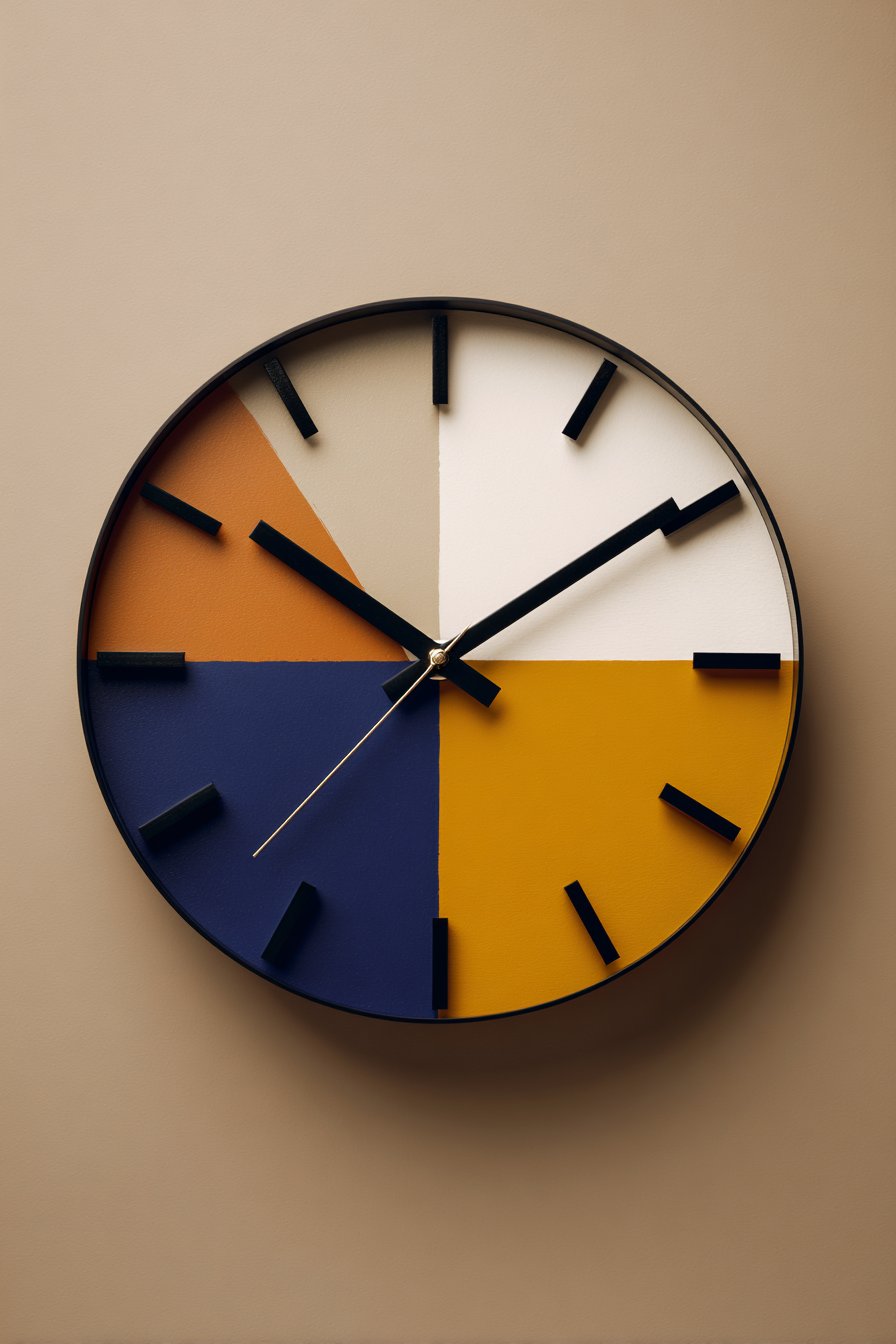 Postmodern design celebrates color, pattern, and playful geometry, all brilliantly expressed in this bold graphic wall clock with Memphis-style aesthetic. The 20-inch statement piece features color-blocked geometric sections in navy blue, mustard yellow, and white creating energetic visual composition. Chunky black hands and simplified hour markers maintain readability while contributing to the graphic design language. This postmodern approach rejects minimalism’s restraint in favor of exuberant expression and visual excitement.