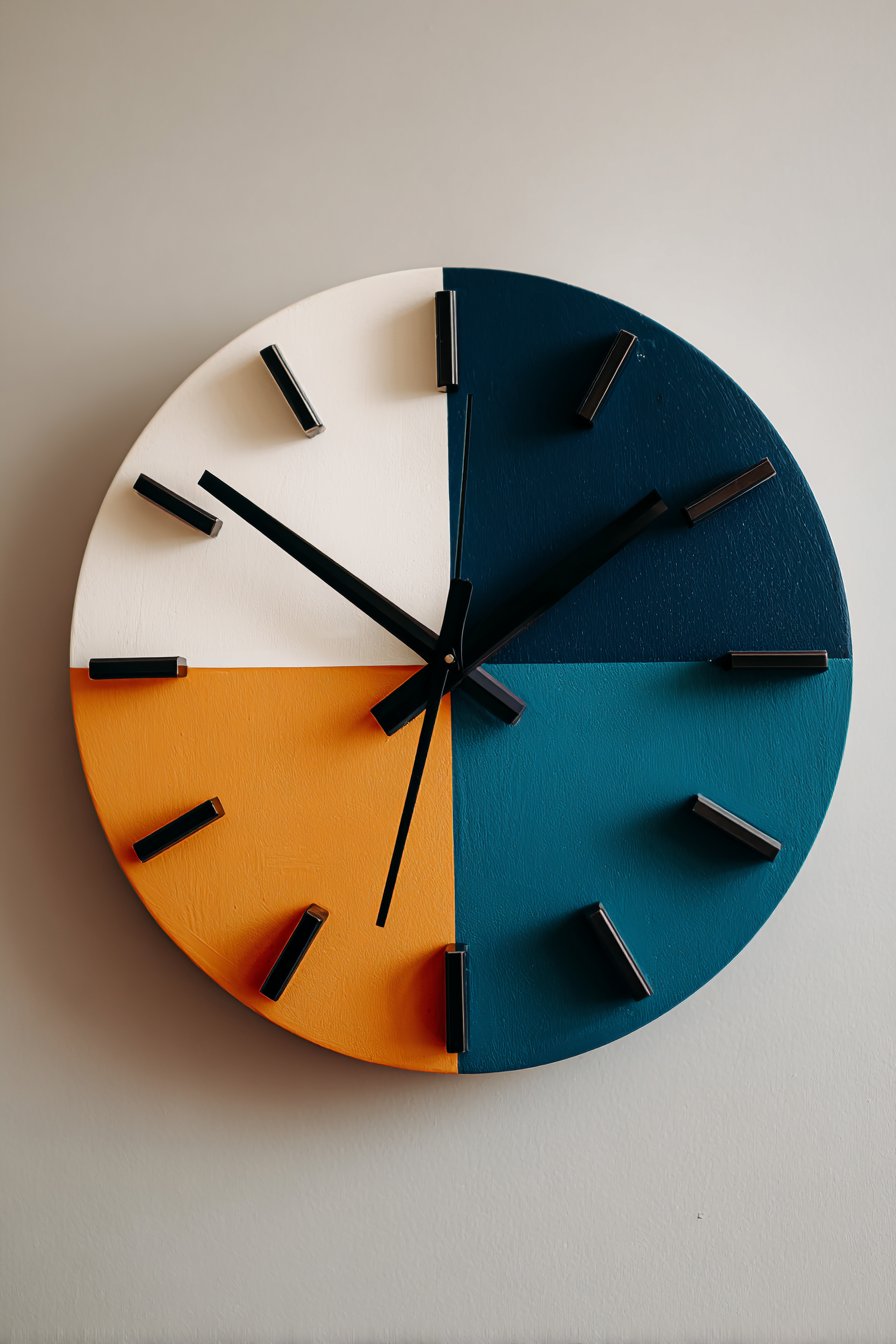 The Memphis design movement of the 1980s rejected both modernist austerity and traditional ornamentation in favor of bold colors, geometric forms, and playful combinations. This clock references those principles while adapting them for contemporary interiors. The chunky hands aren’t accidental—they’re deliberately oversized to match the bold graphic aesthetic. In eclectic spaces that embrace color, pattern, and creative expression, such confident designs provide necessary energy and personality.
