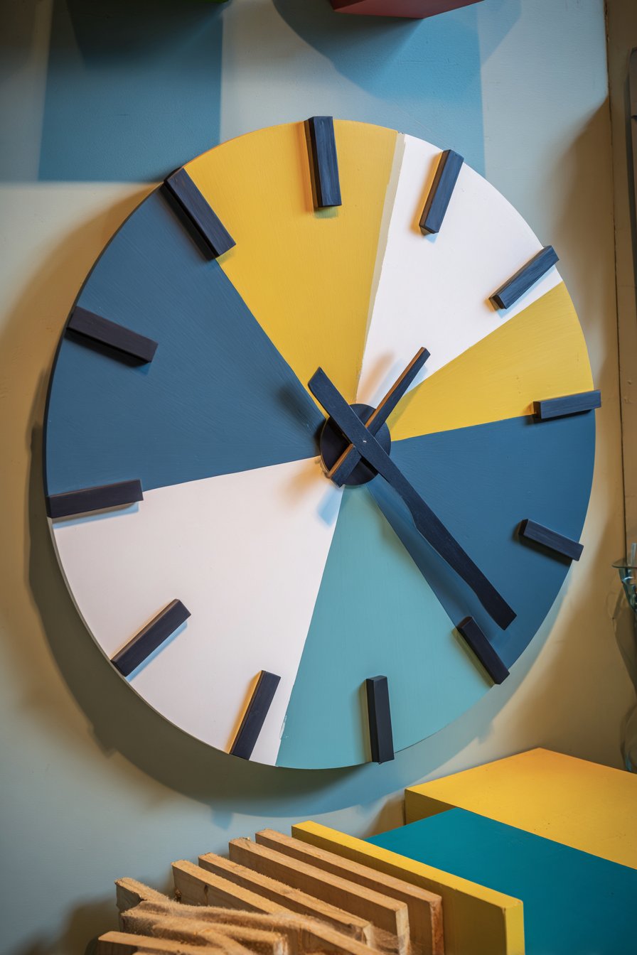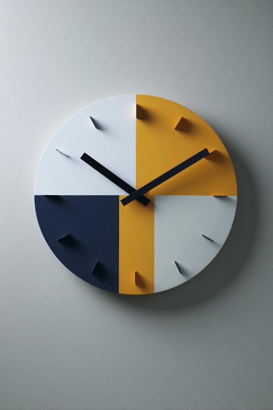 Positioned on a neutral wall in an eclectic living space with contemporary art and vibrant accent pieces, this clock becomes an artwork in its own right. Professional interior photography with even lighting captures the playful color combinations and graphic design elements, demonstrating how the clock contributes to the room’s overall creative energy. The bold color blocking creates strong visual impact from across the room while the geometric composition rewards closer examination. Navy blue provides visual weight and sophistication, mustard yellow adds warmth and energy, and white creates breathing room and contrast.