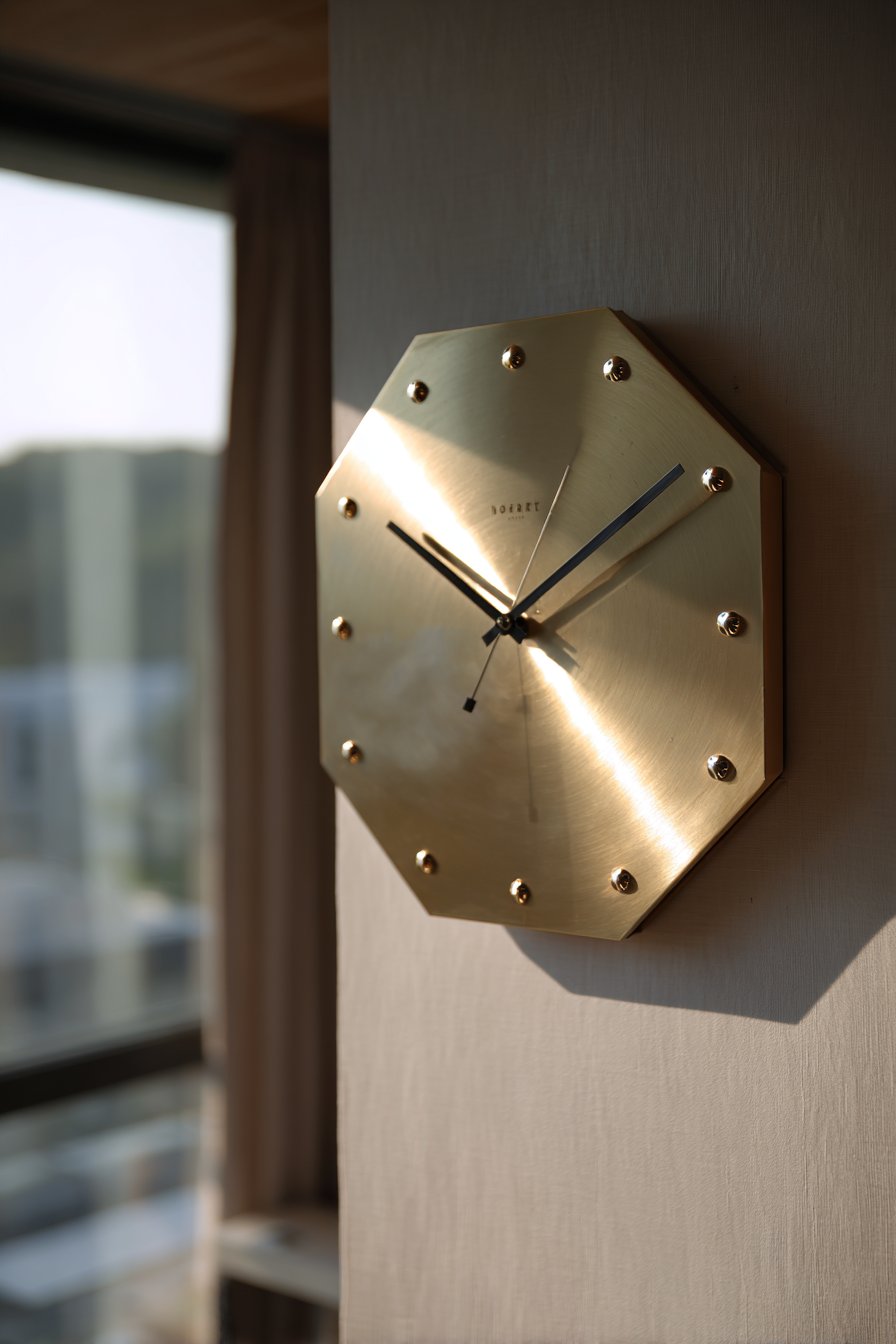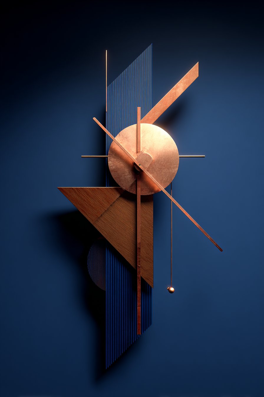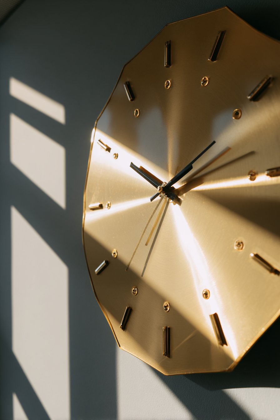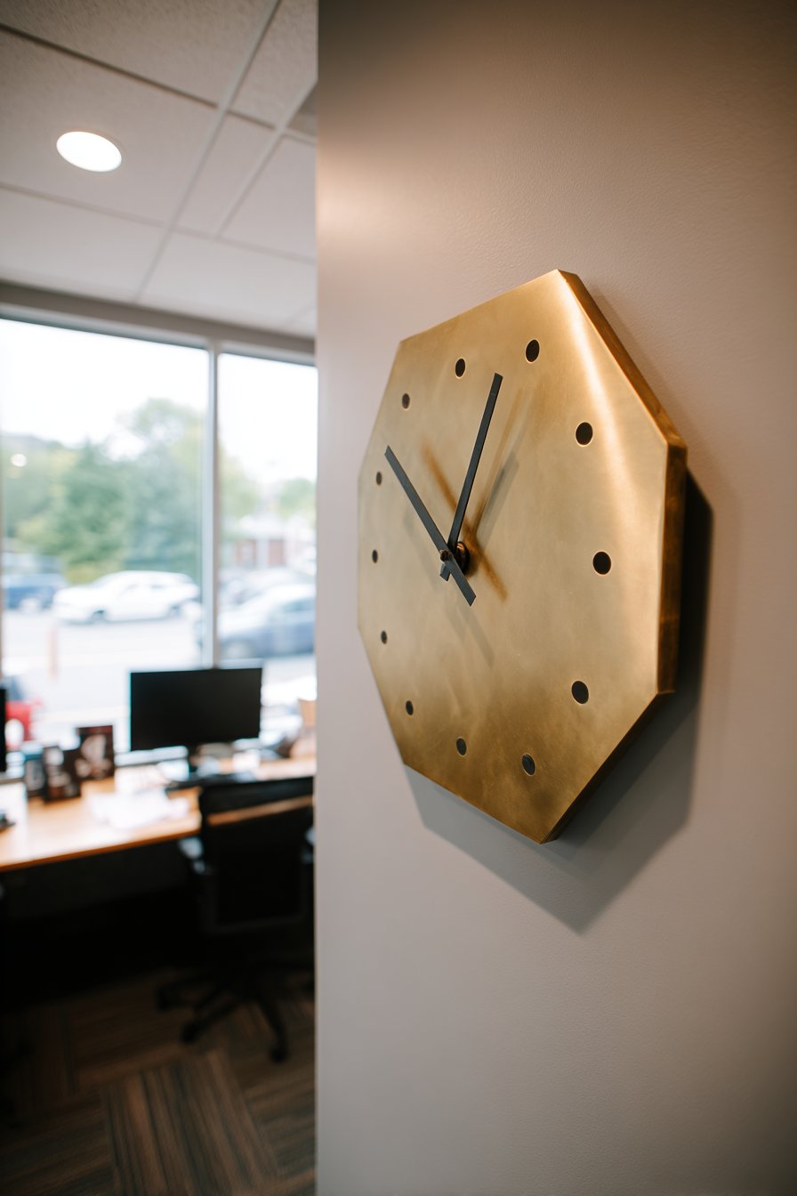 In a sleek home office setting against a soft gray accent wall, this clock becomes a sophisticated focal point that reinforces the professional yet creative atmosphere. Natural light from a nearby window creates ever-changing highlights on the metallic surface, causing the brass to shimmer subtly throughout the day. These light interactions prevent the clock from becoming static decoration, instead making it a dynamic element that responds to environmental conditions. The precise shadows cast by the geometric form add another layer of visual interest, creating patterns on the wall that shift with the sun’s movement.