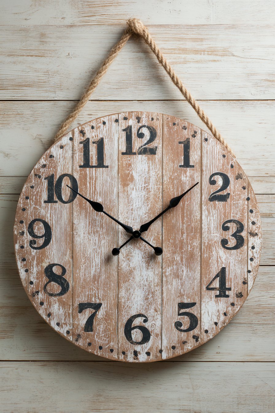 Farmhouse style captures the nostalgia of simpler times while creating spaces that feel welcoming and lived-in, and this rustic wall clock embodies those qualities perfectly. The 30-inch round timepiece features a distressed white-washed finish that suggests years of loving use, with oversized black Arabic numerals that provide both visual impact and easy readability from across the room. A charming rope hanging detail adds authentic farmhouse character, referencing the practical aesthetics of rural living where every element serves both form and function. This design proves that rustic doesn’t mean rough—it means warmly authentic.