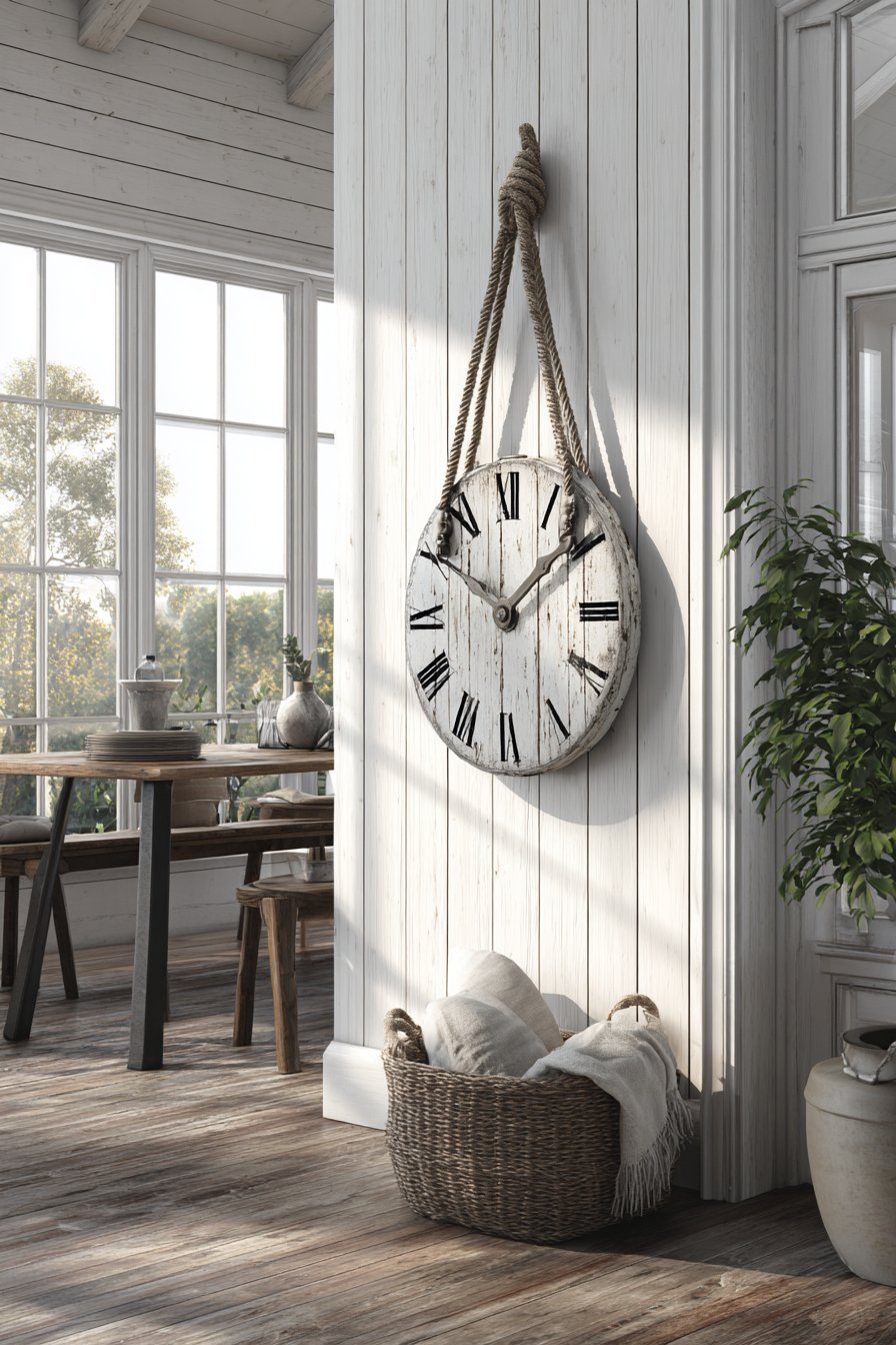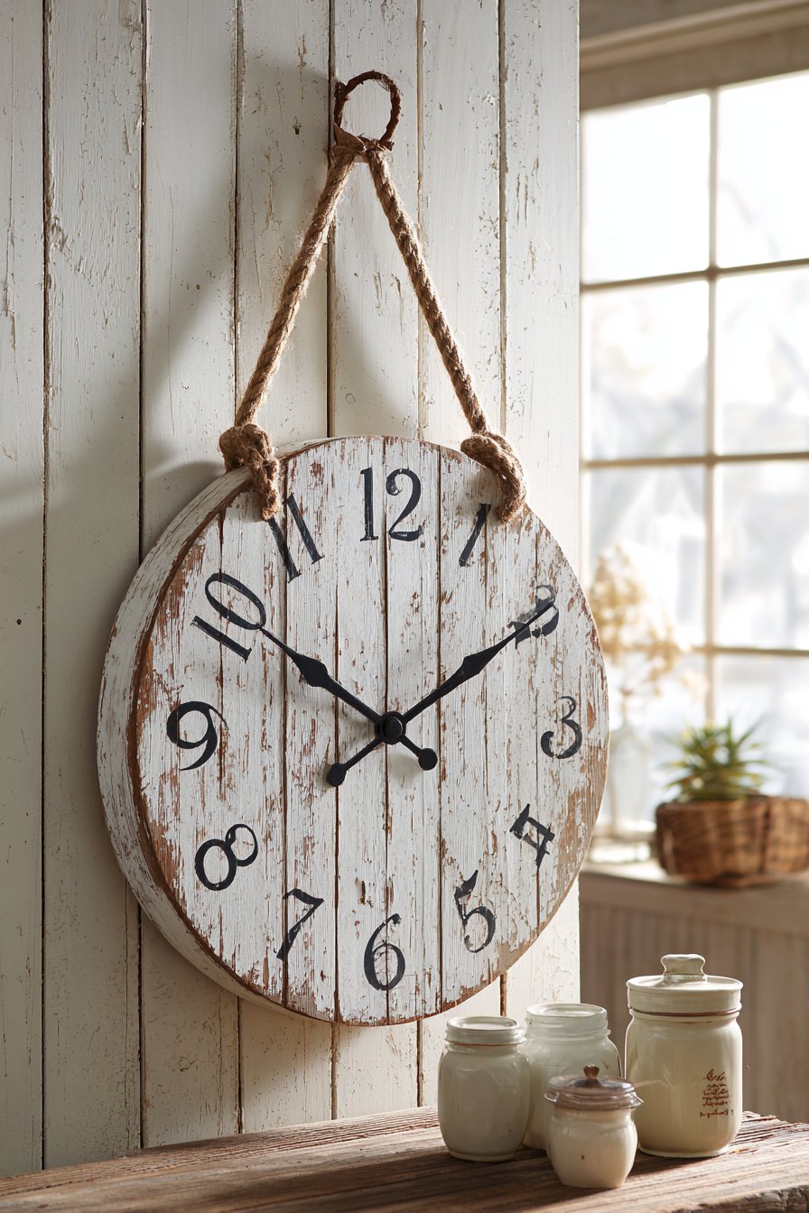 The oversized numerals serve practical and aesthetic purposes simultaneously. In busy kitchen environments where you’re juggling multiple tasks, the ability to quickly glance at the time without searching for tiny markers becomes genuinely valuable. Meanwhile, the bold black numbers against the white background create strong graphic contrast that anchors the design. The rope hanging detail might seem purely decorative, but it actually reinforces the farmhouse narrative by referencing traditional materials and craft techniques that connect us to our agricultural heritage.