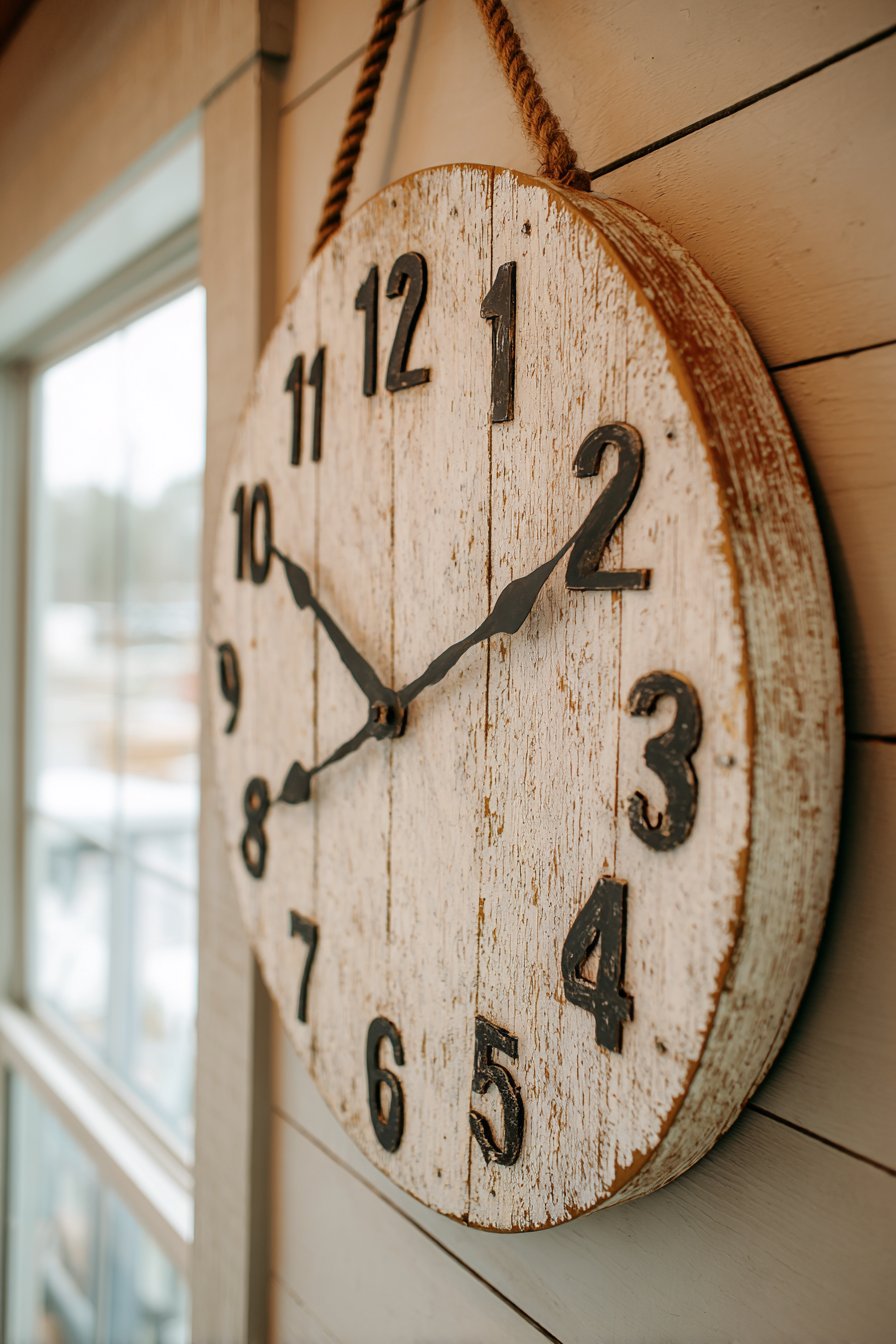 Mounted on shiplap wall paneling in a country-style kitchen, this clock finds its spiritual home. The horizontal lines of the shiplap create a perfect backdrop for the circular form, while soft natural lighting from kitchen windows highlights the weathered wood texture and hand-painted numbers. The distressed finish isn’t artificially perfect; it includes slight variations in the whitewash coverage that expose hints of the underlying wood, creating depth and visual interest. These imperfections aren’t flaws—they’re intentional design elements that communicate warmth and approachability.