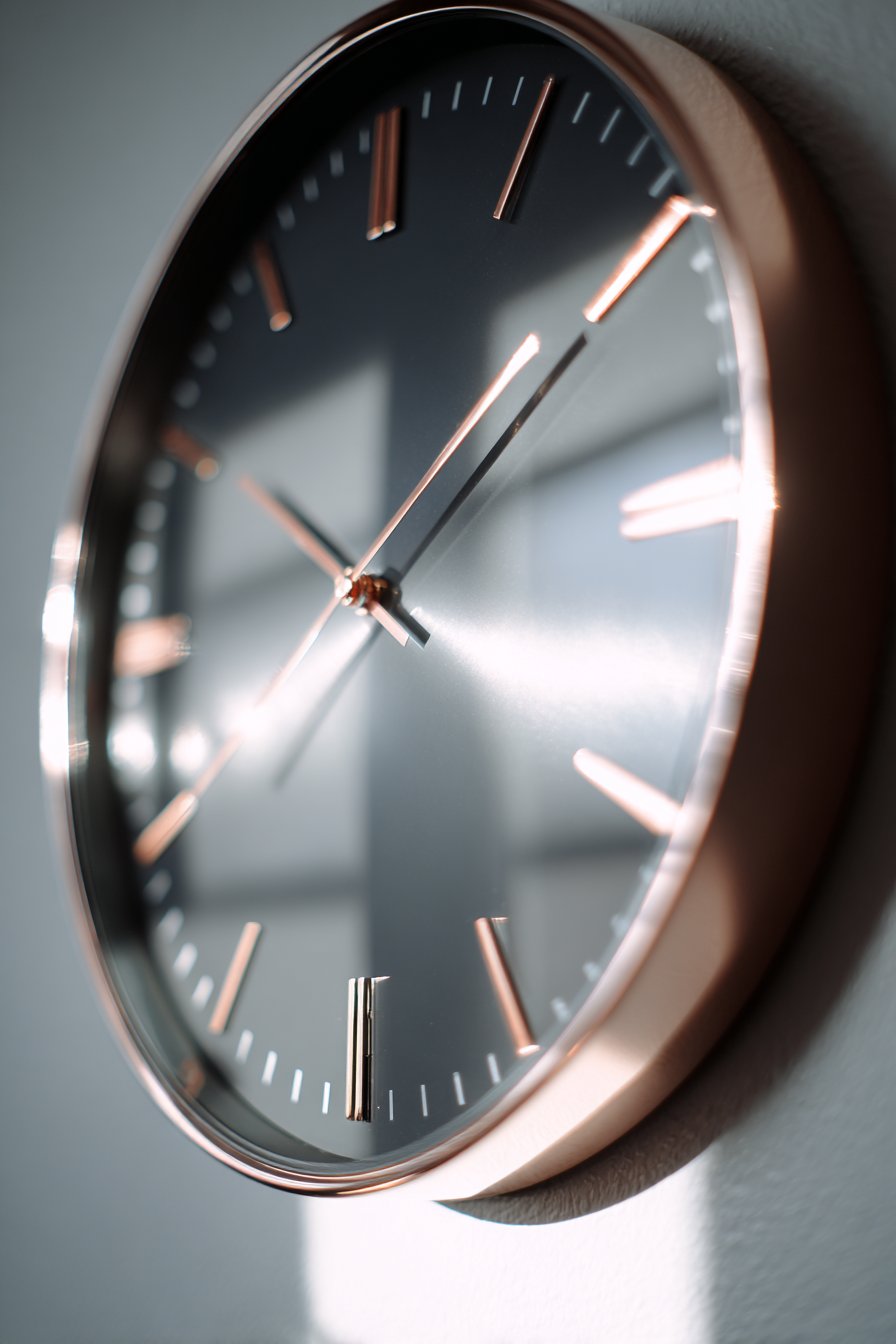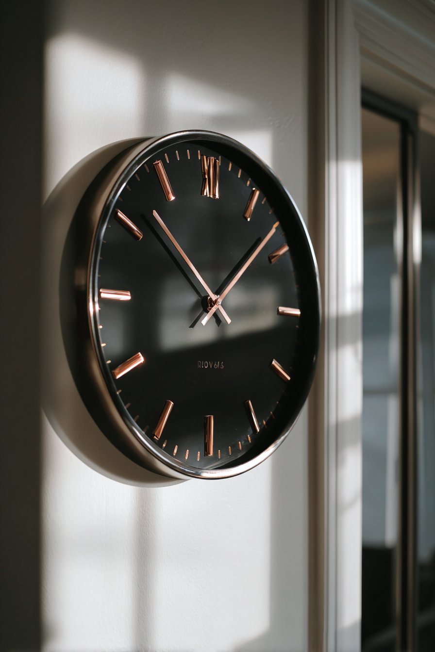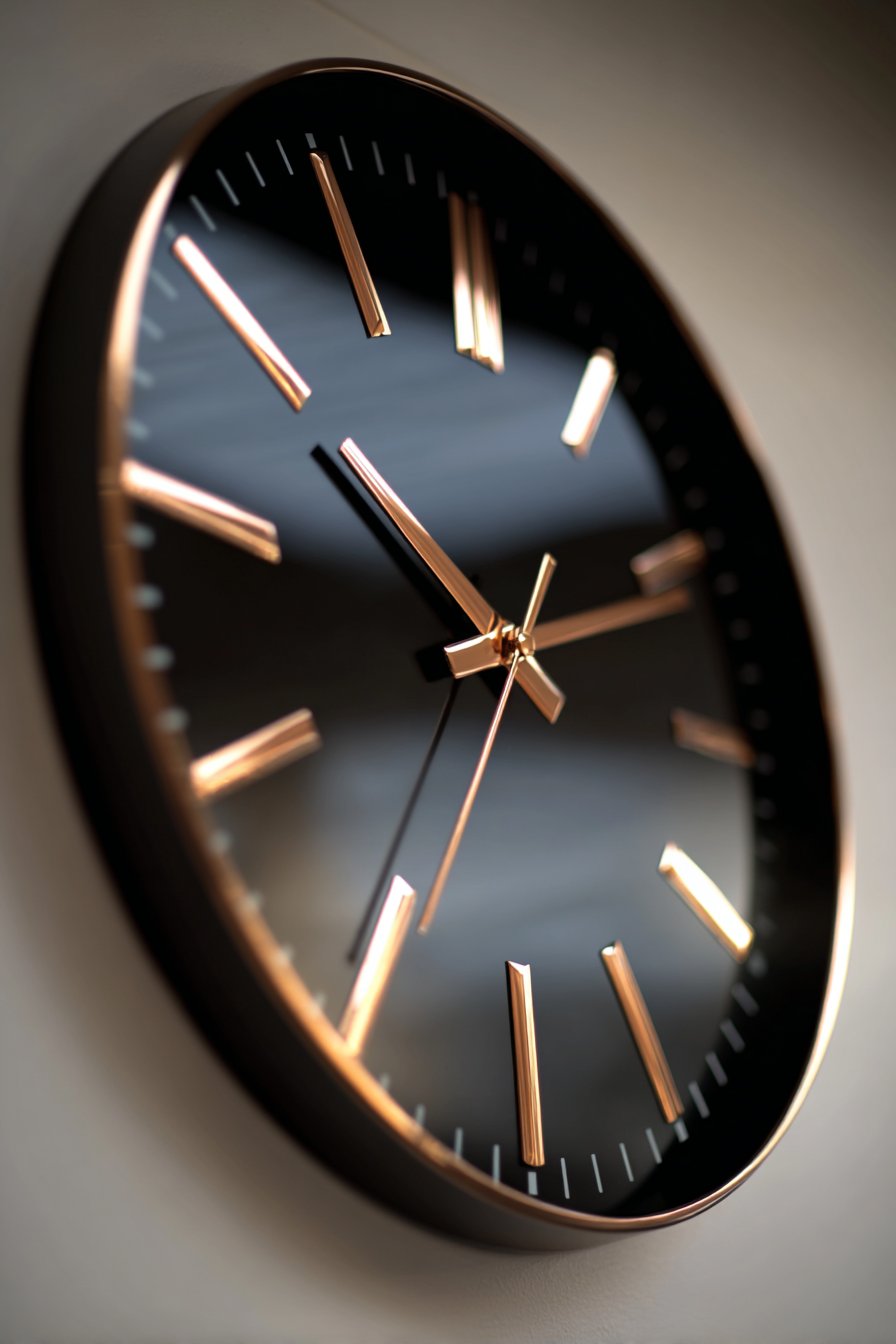 Mounted on a crisp white wall in a modern bedroom setting, this clock demonstrates the power of restrained elegance. Soft morning light creates gentle highlights on the metallic rose gold elements, causing them to glow warmly against the matte black frame. This interplay of finishes—matte versus metallic, black versus rose gold, circular frame versus linear hands—creates visual interest through contrast while maintaining overall harmony. The thin profile ensures the clock doesn’t protrude awkwardly from the wall, instead sitting nearly flush for a streamlined appearance that complements contemporary architectural preferences.