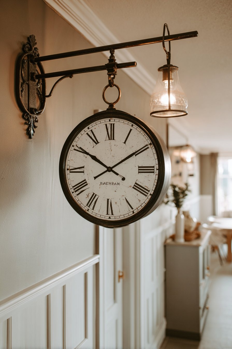 • Pair vintage-style clocks with period-appropriate architectural details like wainscoting or crown molding