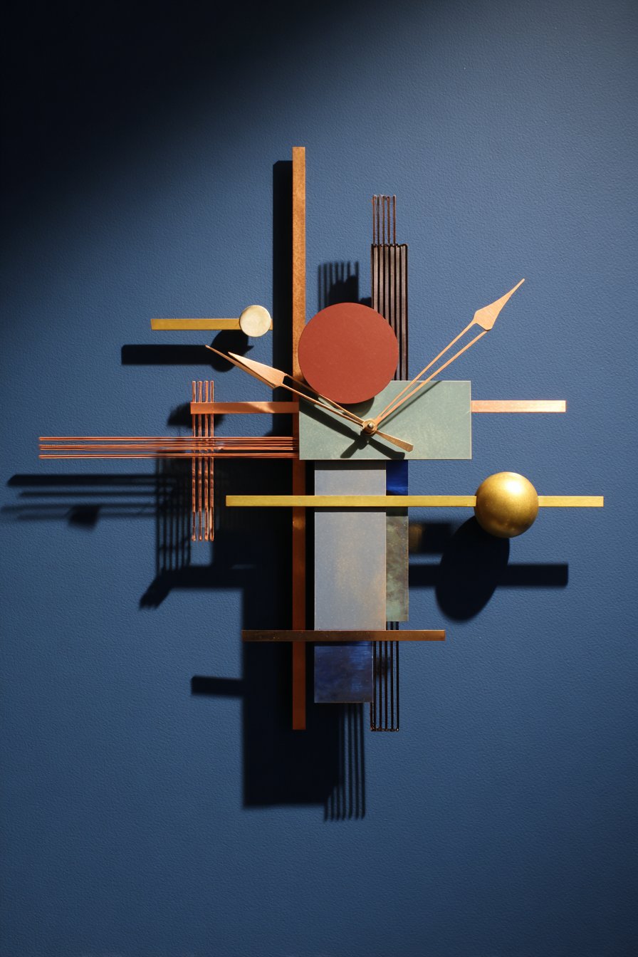Contemporary art and functional design merge spectacularly in this modern abstract wall clock that challenges conventional timepiece aesthetics. The 22-inch creation features asymmetrical geometric shapes crafted from mixed metals including copper, brass, and stainless steel, creating a composition that’s as much sculpture as clock. The floating elements and off-center clock mechanism defy traditional symmetry, introducing dynamic visual tension that engages the eye and invites contemplation. This isn’t a clock you simply glance at—it’s one that rewards closer examination and appreciation.