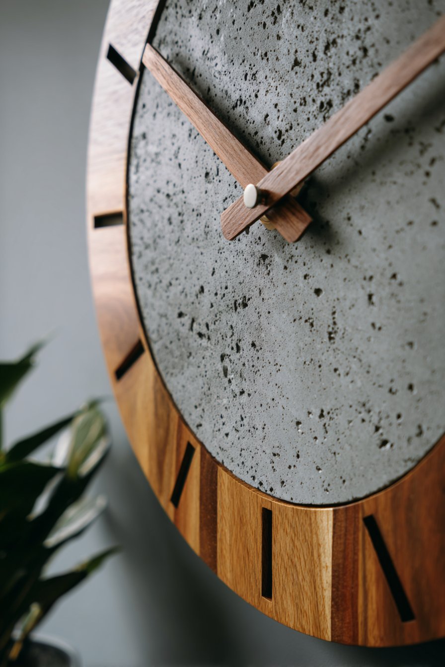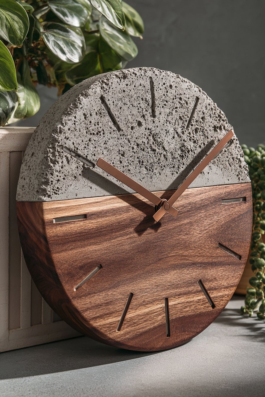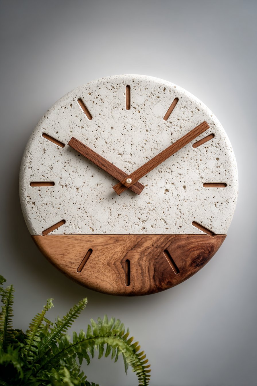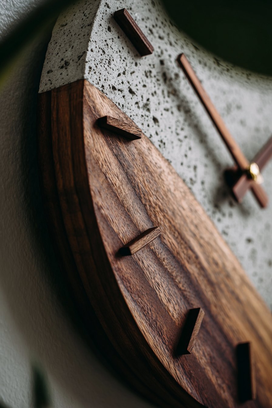 The exposed aggregate texture in the concrete isn’t a flaw—it’s a deliberate design choice that celebrates the material’s authentic nature. Rather than hiding concrete’s composite structure, this clock reveals it, making visible the small stones and sand particles that give concrete its strength. The walnut wood hands introduce warmth and organic curves into a composition dominated by the circular concrete’s geometric form. This marriage of materials represents the broader contemporary design movement toward authenticity, craftsmanship, and material appreciation.