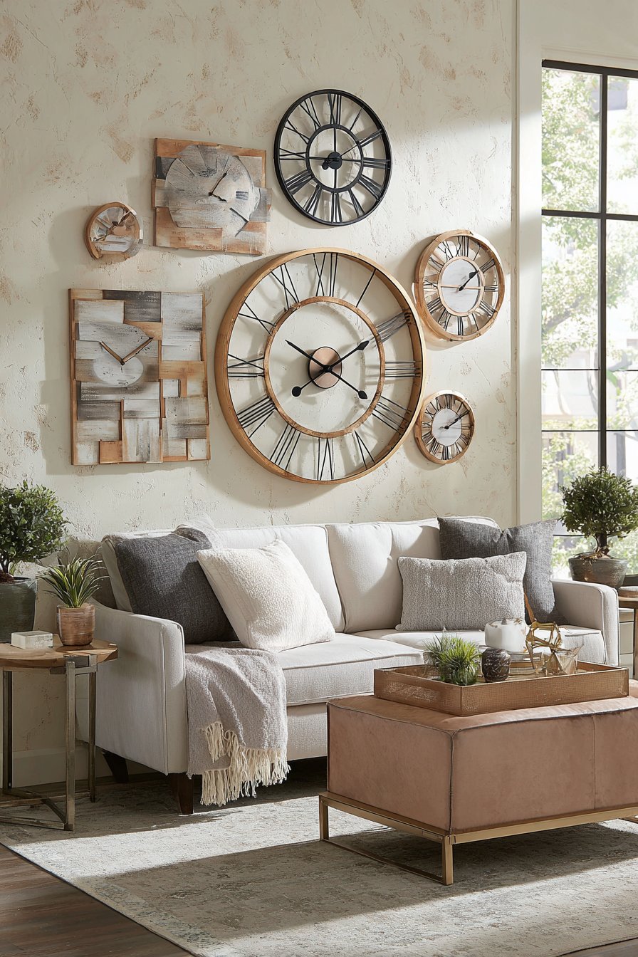 Creating a dynamic focal point on a textured cream wall in an eclectic living room, this gallery approach introduces rhythm and movement to what might otherwise be static decoration. Soft natural lighting from windows highlights the varied frames and creates interesting overlapping shadows that change throughout the day. The different sizes create hierarchical visual interest, with the largest clock serving as an anchor while smaller pieces orbit around it like satellites. This astronomical metaphor isn’t accidental—thoughtful gallery walls create their own gravitational systems that draw the eye in predictable patterns.