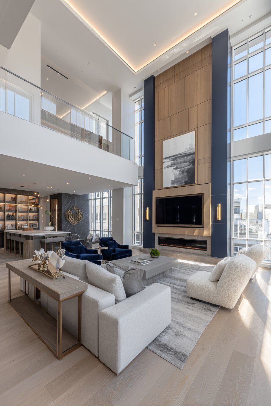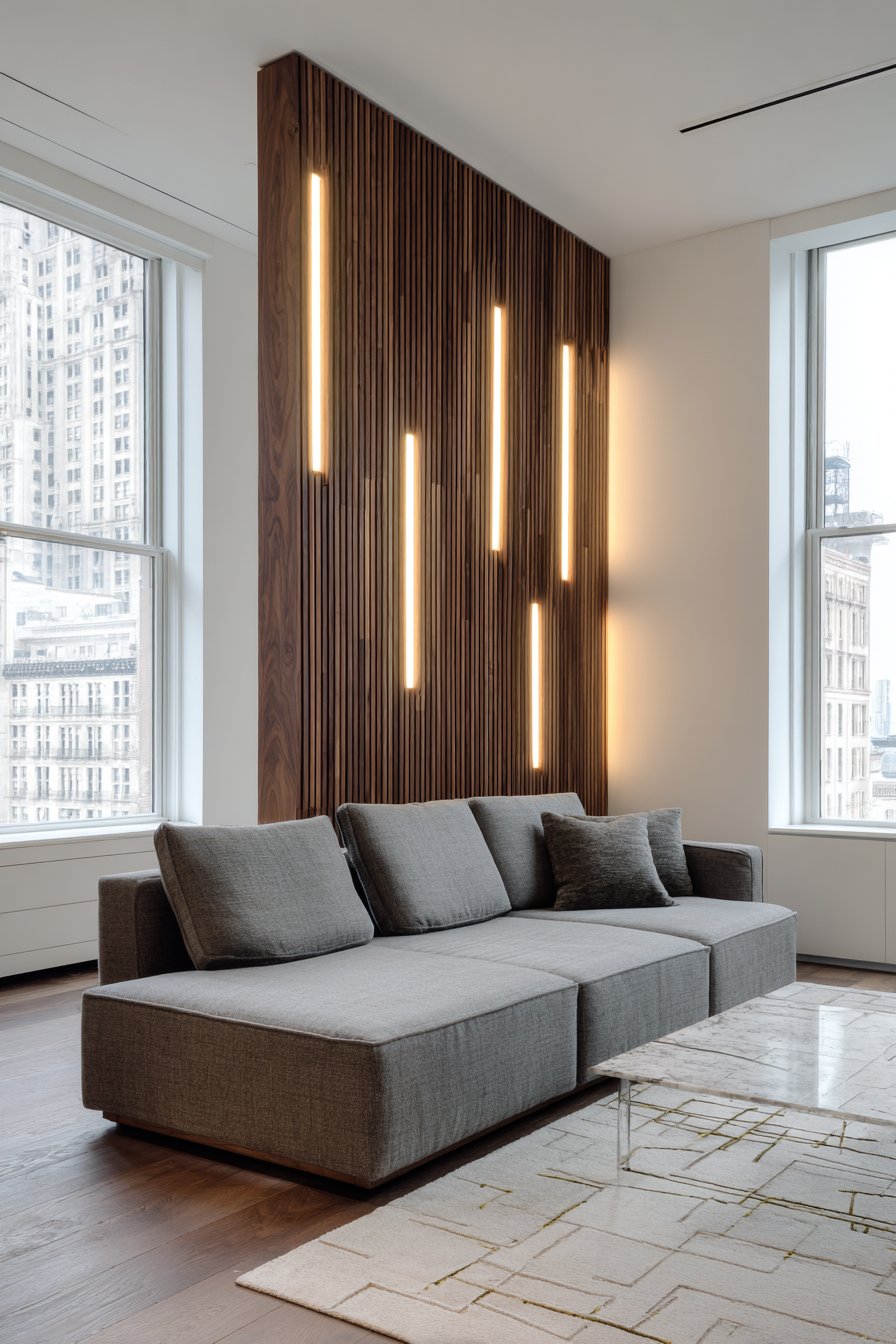 The contemporary living room featuring vertical wood slat wall design ideas brings a sophisticated architectural element that instantly elevates the space. Natural walnut panels create stunning depth and visual texture when mounted against a pristine white background, with carefully calculated spacing that allows light and shadow to interact throughout the day. This installation demonstrates how wall design ideas can transform a simple flat surface into a dynamic focal point that draws the eye and anchors the entire room’s aesthetic.