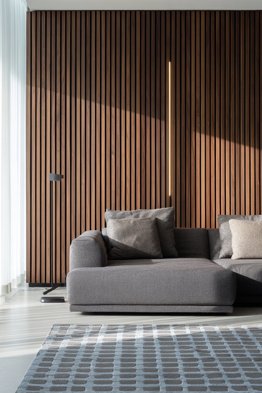 Positioned in front of this architectural feature, a contemporary gray sectional sofa provides comfortable seating while allowing the wall treatment to remain the room’s star attraction. The geometric area rug introduces pattern at floor level, creating visual balance without competing with the vertical emphasis of the slat design. Wide-angle interior photography captures how natural light from adjacent windows creates constantly shifting patterns of illumination and shadow across the wood surface, making this wall a living element that changes character throughout the day.