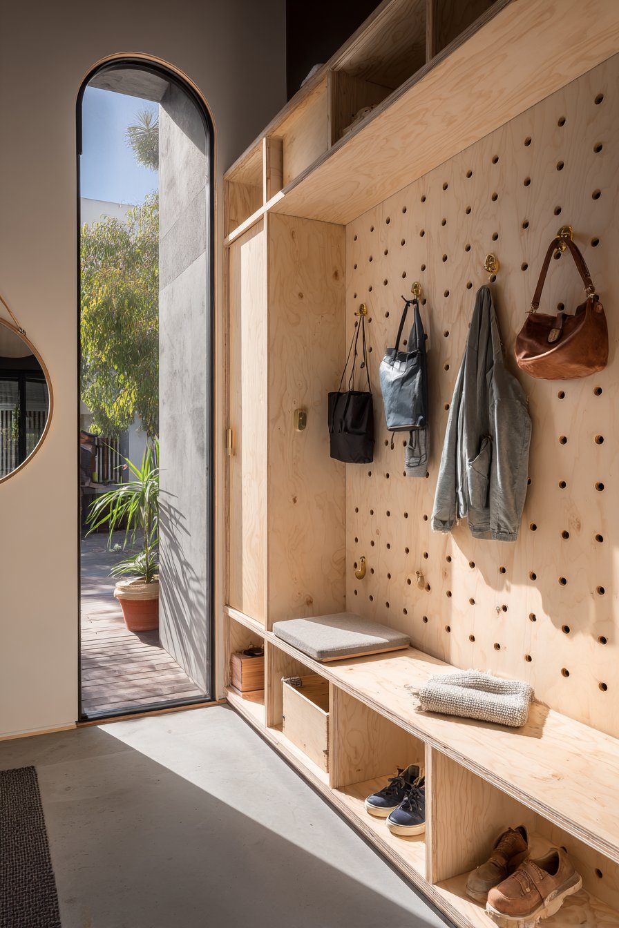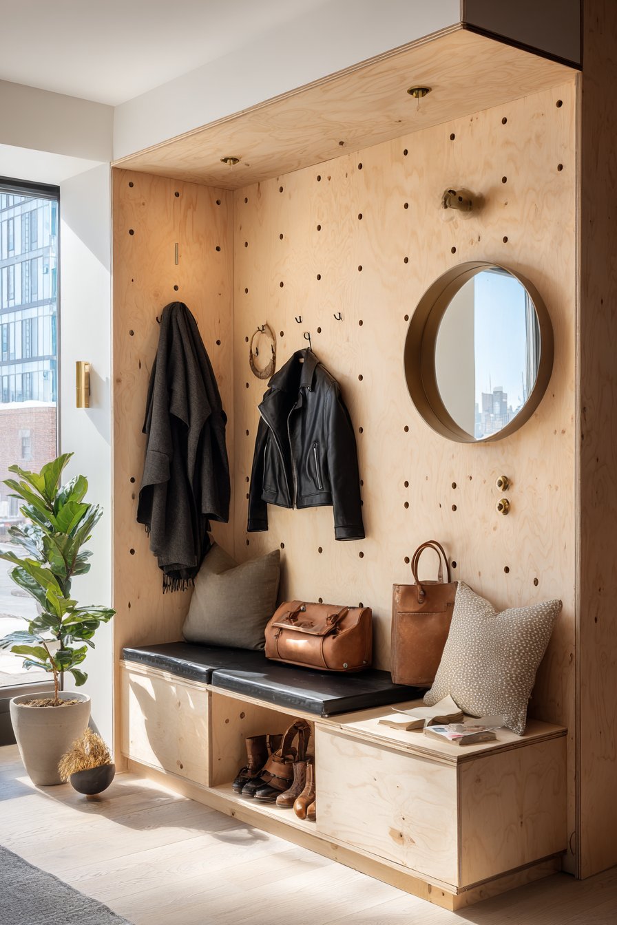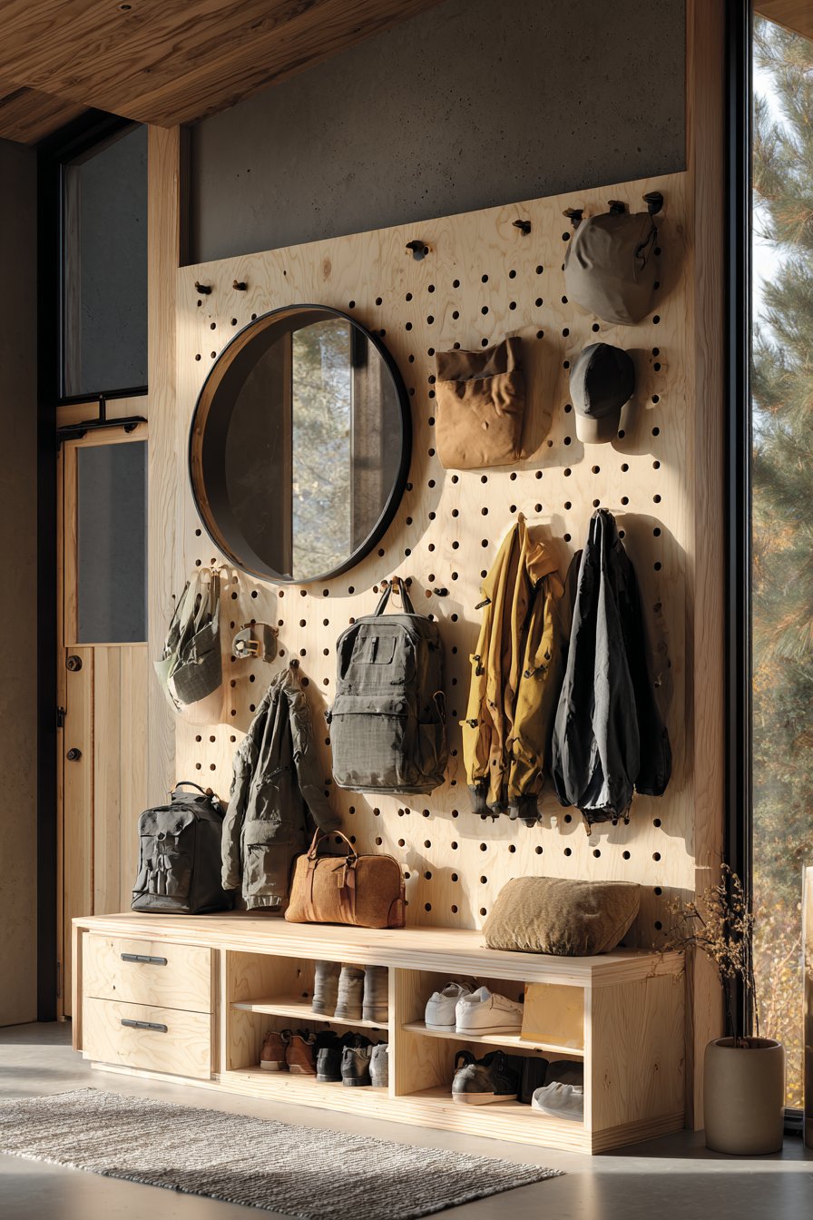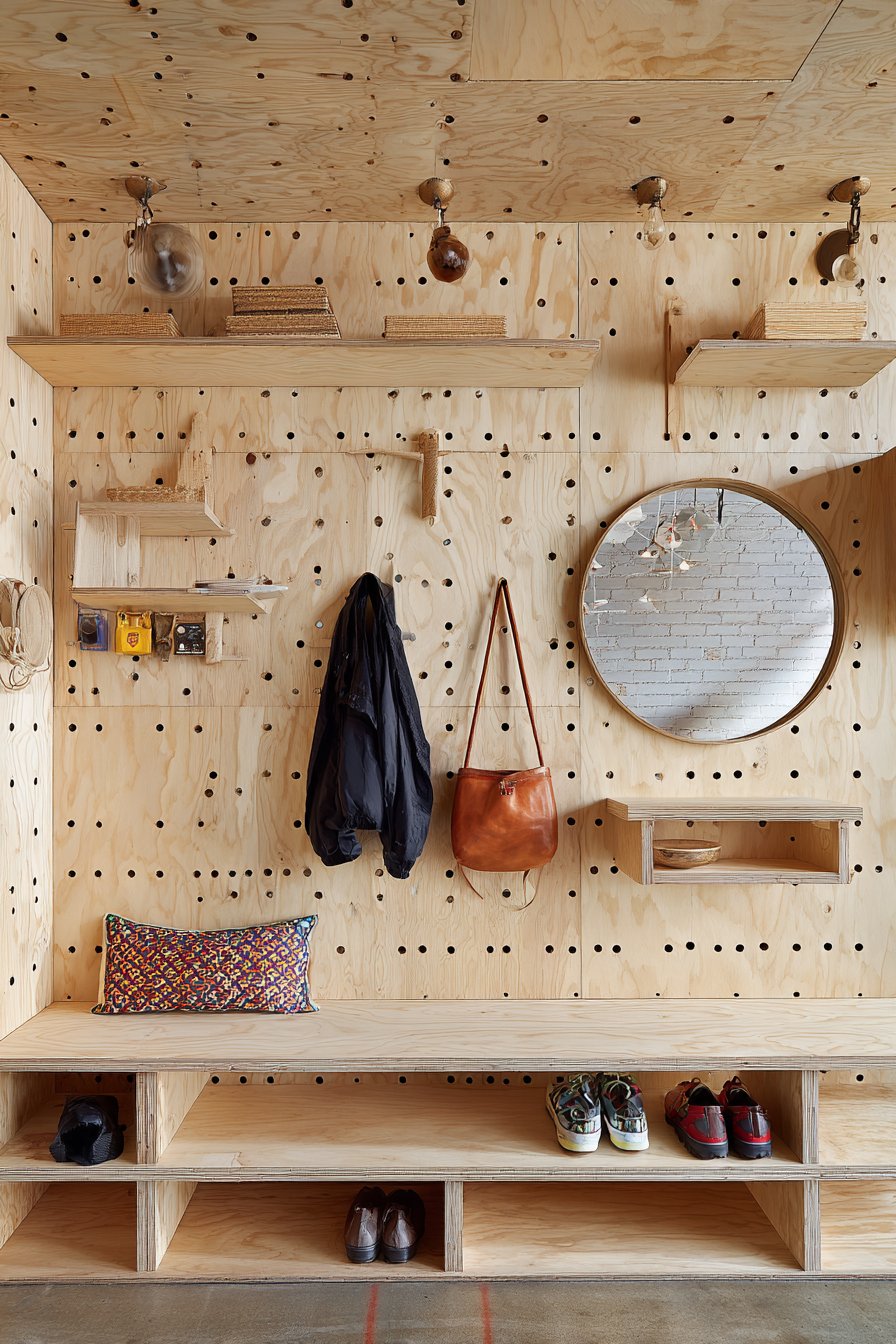 Home entryway wall design ideas prioritize practical organization through a floor-to-ceiling pegboard wall system in natural birch plywood, featuring an organized grid of wooden pegs for hanging coats, bags, and accessories. This installation demonstrates how wall design ideas can be primarily functional while still delivering strong aesthetic impact through material choice and thoughtful composition. The pegboard spans the full wall height with integrated bench seating below that incorporates hidden storage, creating a comprehensive mudroom solution that maximizes vertical space.