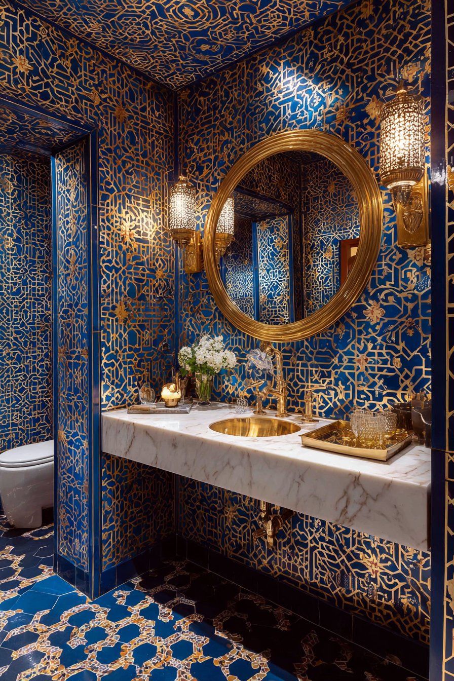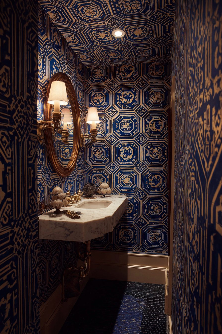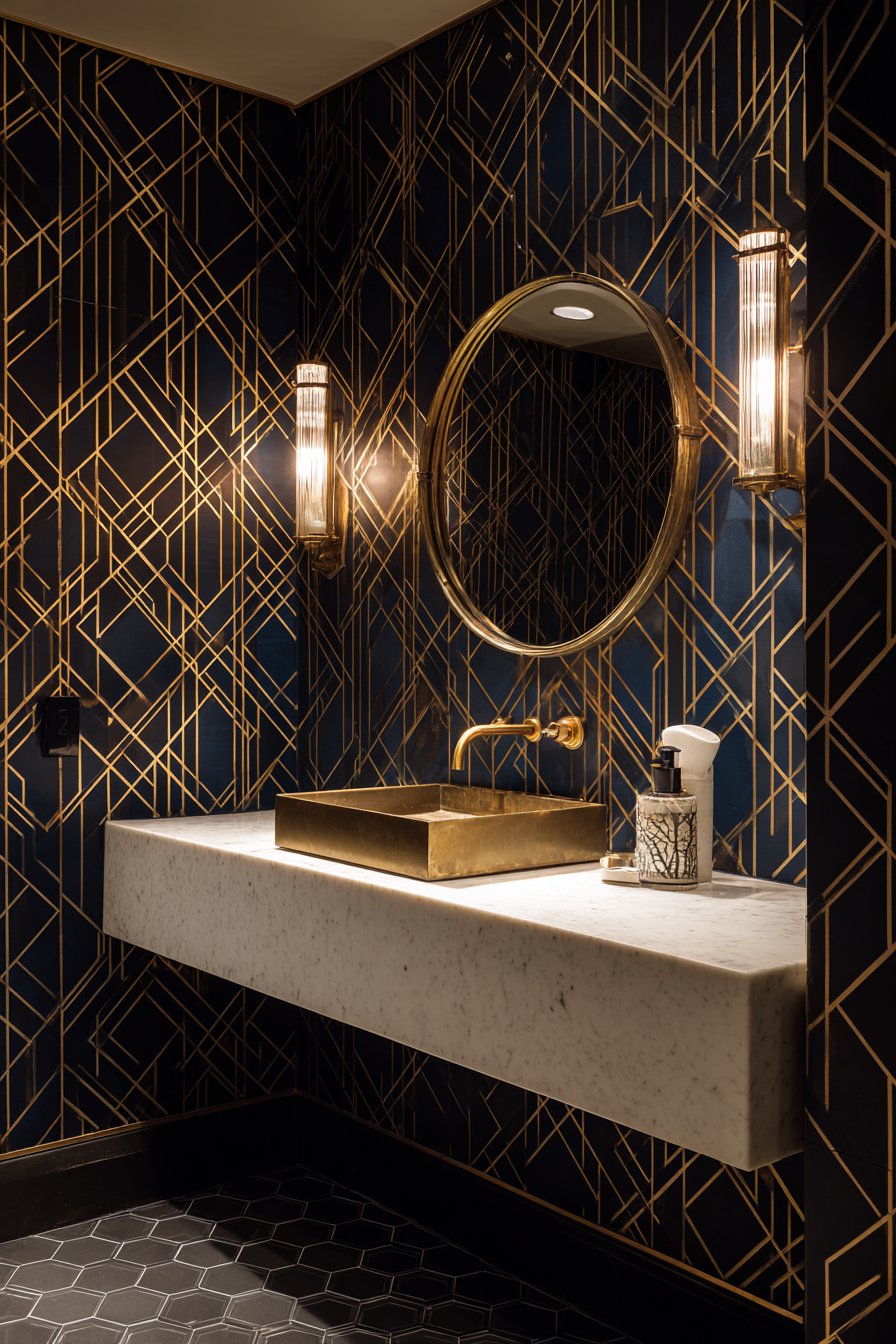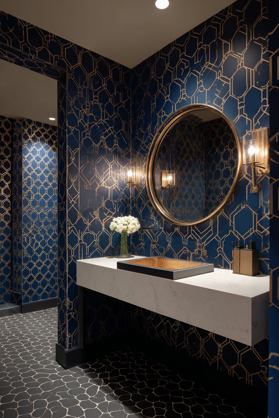 Powder room wall design ideas make dramatic statements through bold geometric wallpaper in navy blue and gold metallic design, creating an intimate jewel-box effect perfect for small spaces. This installation demonstrates how wall design ideas can transform compact rooms into memorable experiences through fearless pattern and color. The dramatic pattern covers all walls, creating immersive environment complemented by a brass-framed round mirror and matching wall sconces that echo the wallpaper’s metallic accents.