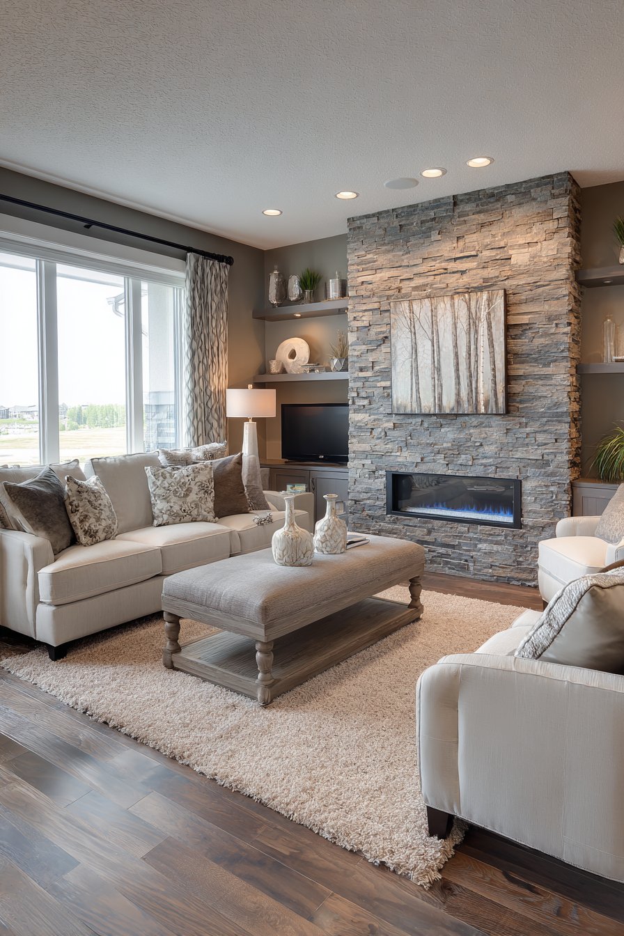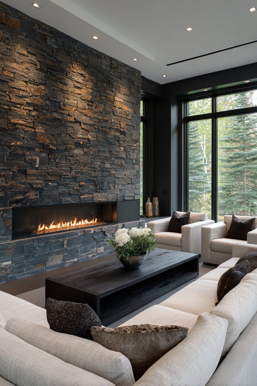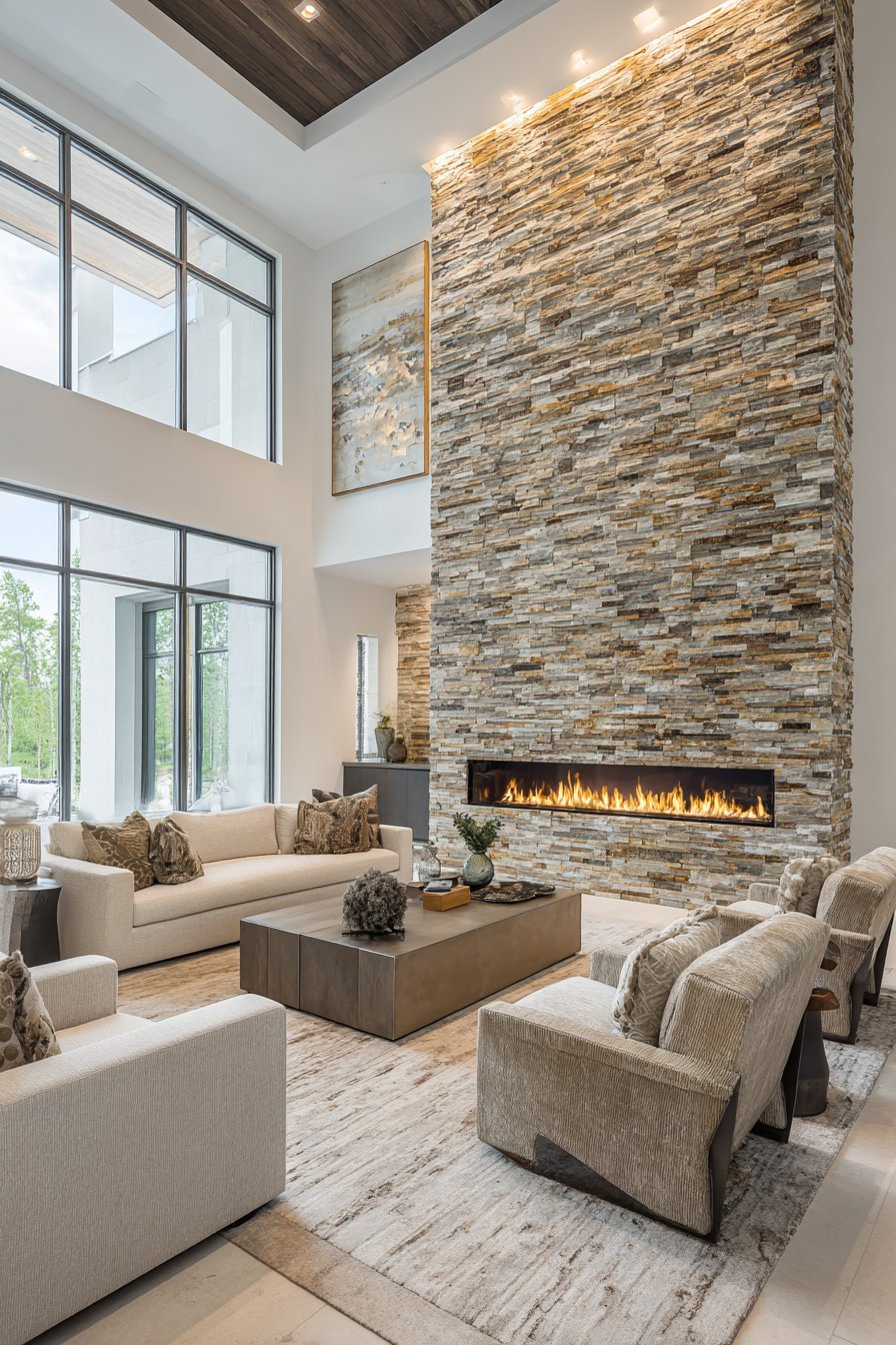 Modern living room wall design ideas achieve organic elegance through floor-to-ceiling stone veneer accent wall in stacked natural ledgestone, creating earthy texture with tones ranging from gray to taupe. This installation demonstrates how wall design ideas can bring outdoor materials inside to create connection with nature while adding substantial architectural presence. A linear gas fireplace integrates seamlessly into the stone wall, its contemporary clean-lined design providing beautiful contrast with the organic stone texture.