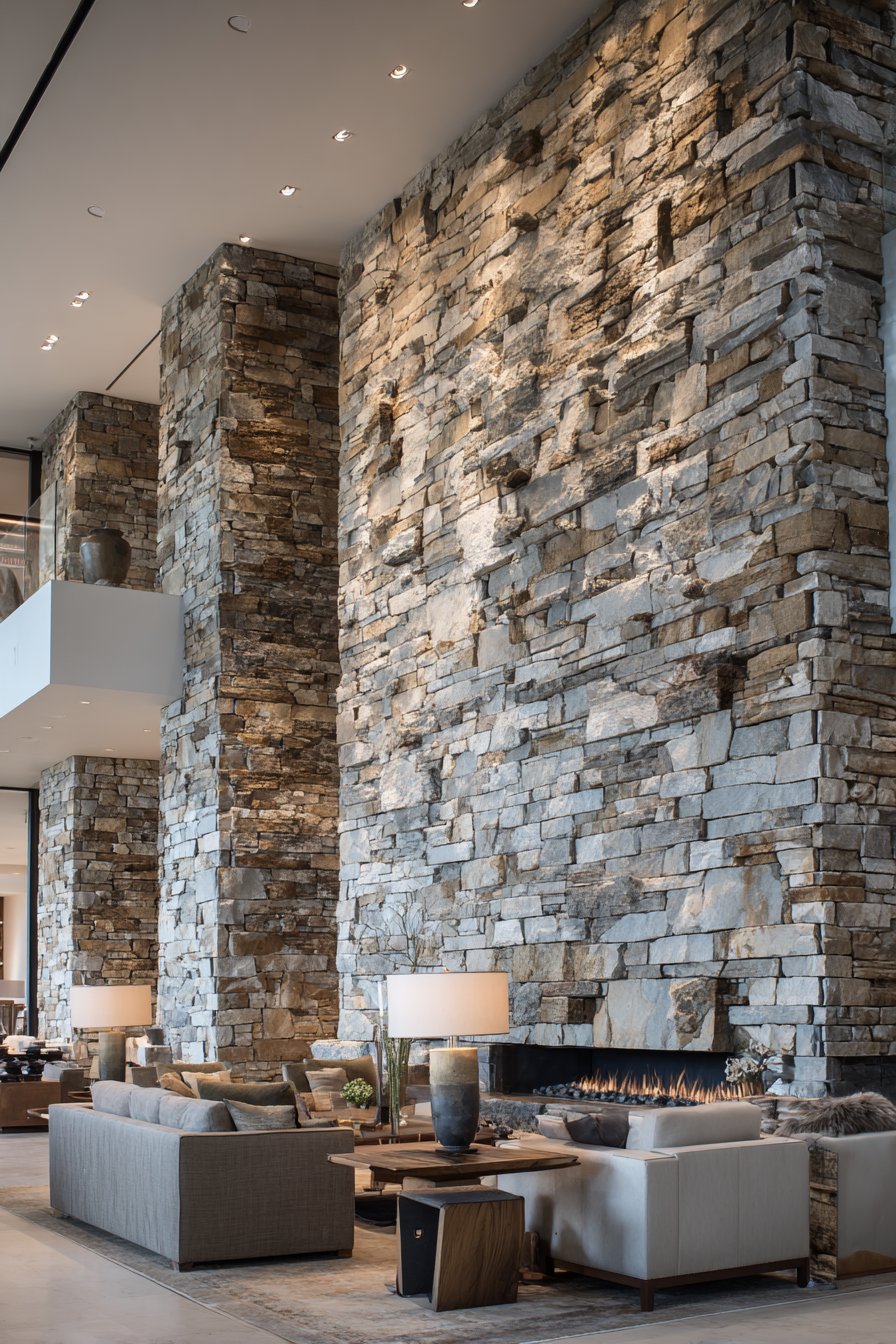 Wide-angle interior design photography captures the full stone installation with balanced exposure showing individual stone texture and color variation that makes natural materials so compelling. Natural ambient lighting creates authentic shadow play between stone layers, revealing the genuine depth of the stacked installation. The stone veneer demonstrates how wall design ideas can introduce natural materials in spaces where full-thickness stone would be impractical, delivering authentic appearance at reduced weight and cost while still achieving the substantial presence and organic beauty of natural stone.