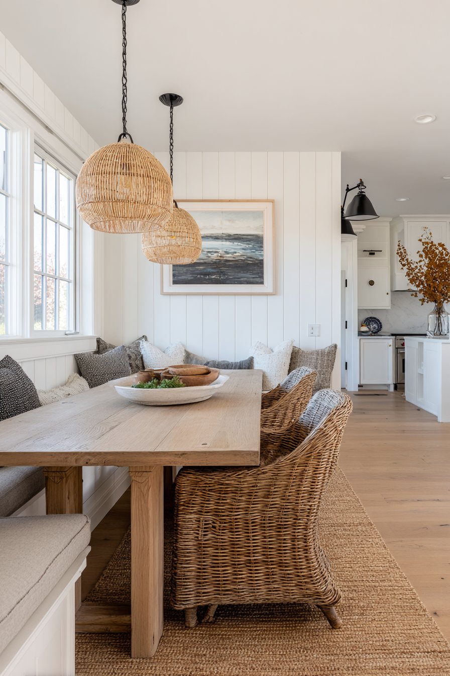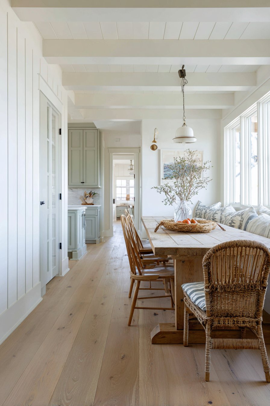 Dining room wall design ideas embrace traditional architecture through board and batten wall treatment in classic white, featuring vertical boards with horizontal battens creating timeless panel details. This wainscoting-style installation extends to chair rail height with painted wall above in soft greige, demonstrating how wall design ideas can add architectural interest to rooms lacking original detail. The traditional panel treatment brings depth and dimension to flat walls while the two-tone color approach adds subtle sophistication.