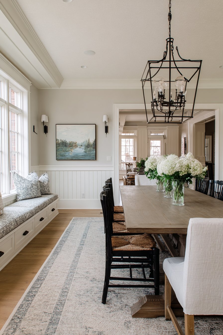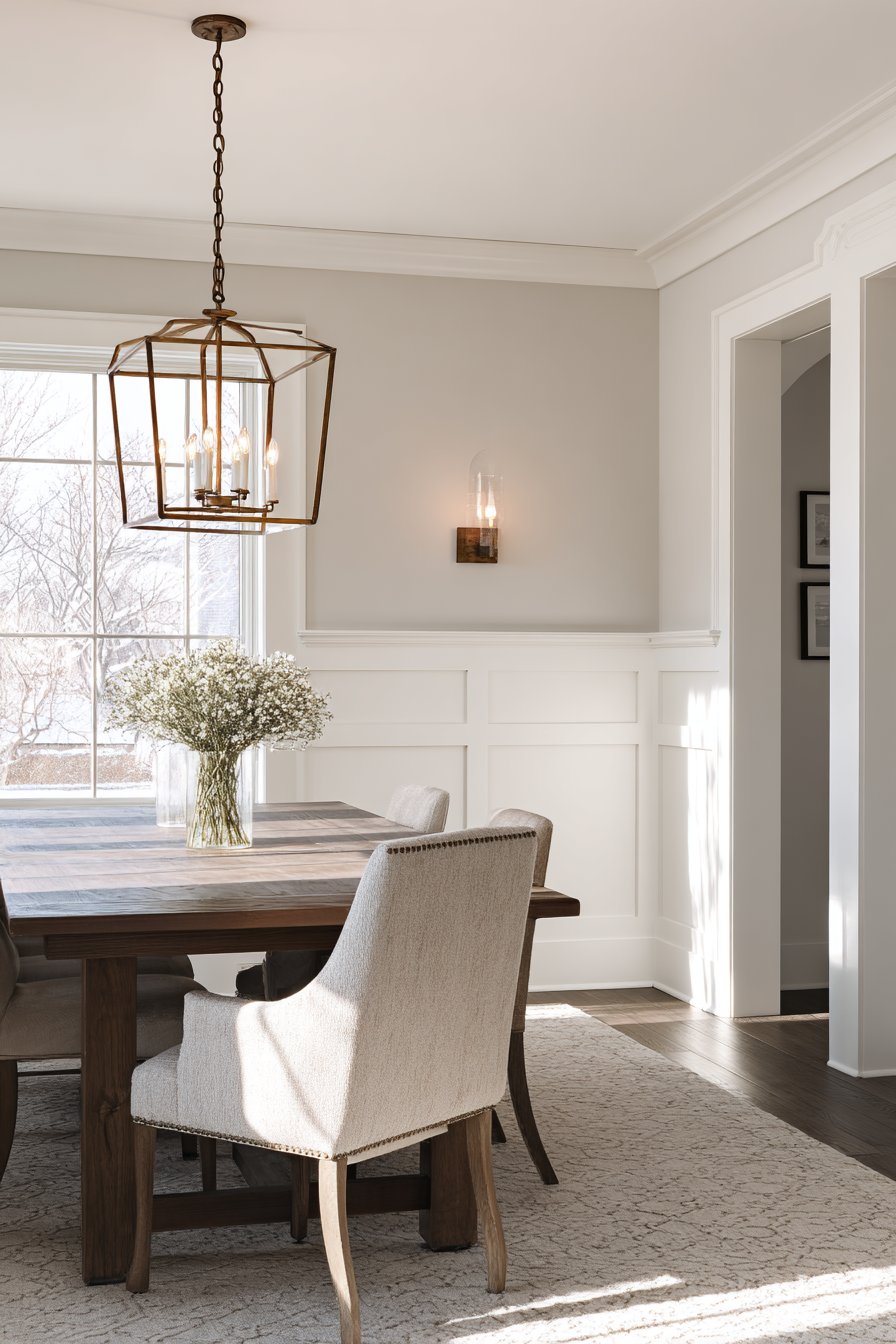 A farmhouse-style dining table with mixed seating anchors the space, its casual character complementing the more formal wall treatment in perfect balance between approachable and refined. Vintage-inspired lighting fixtures echo the traditional wall detail while providing ambient illumination that enhances the room’s warm, welcoming atmosphere. The greige upper wall color introduces warmth without the darkness of deeper colors, creating ideal backdrop for artwork or shelving while maintaining visual connection to the white board and batten below.