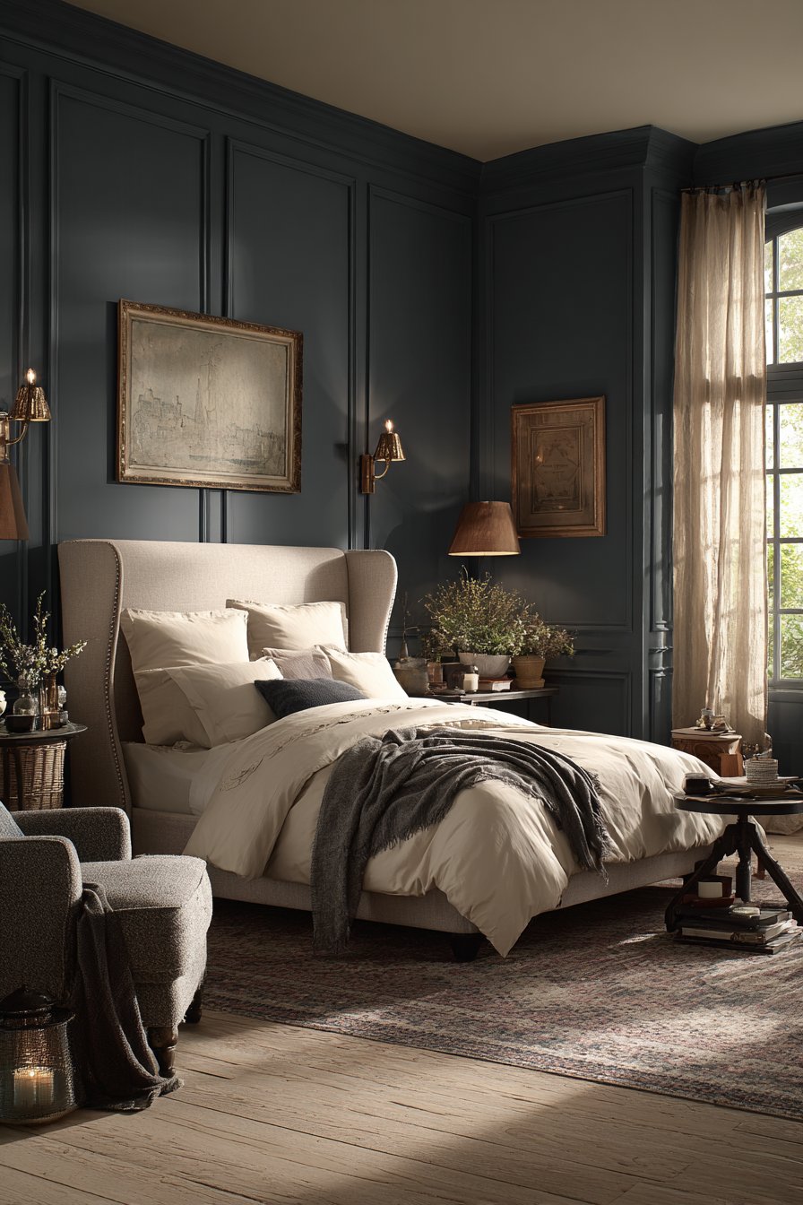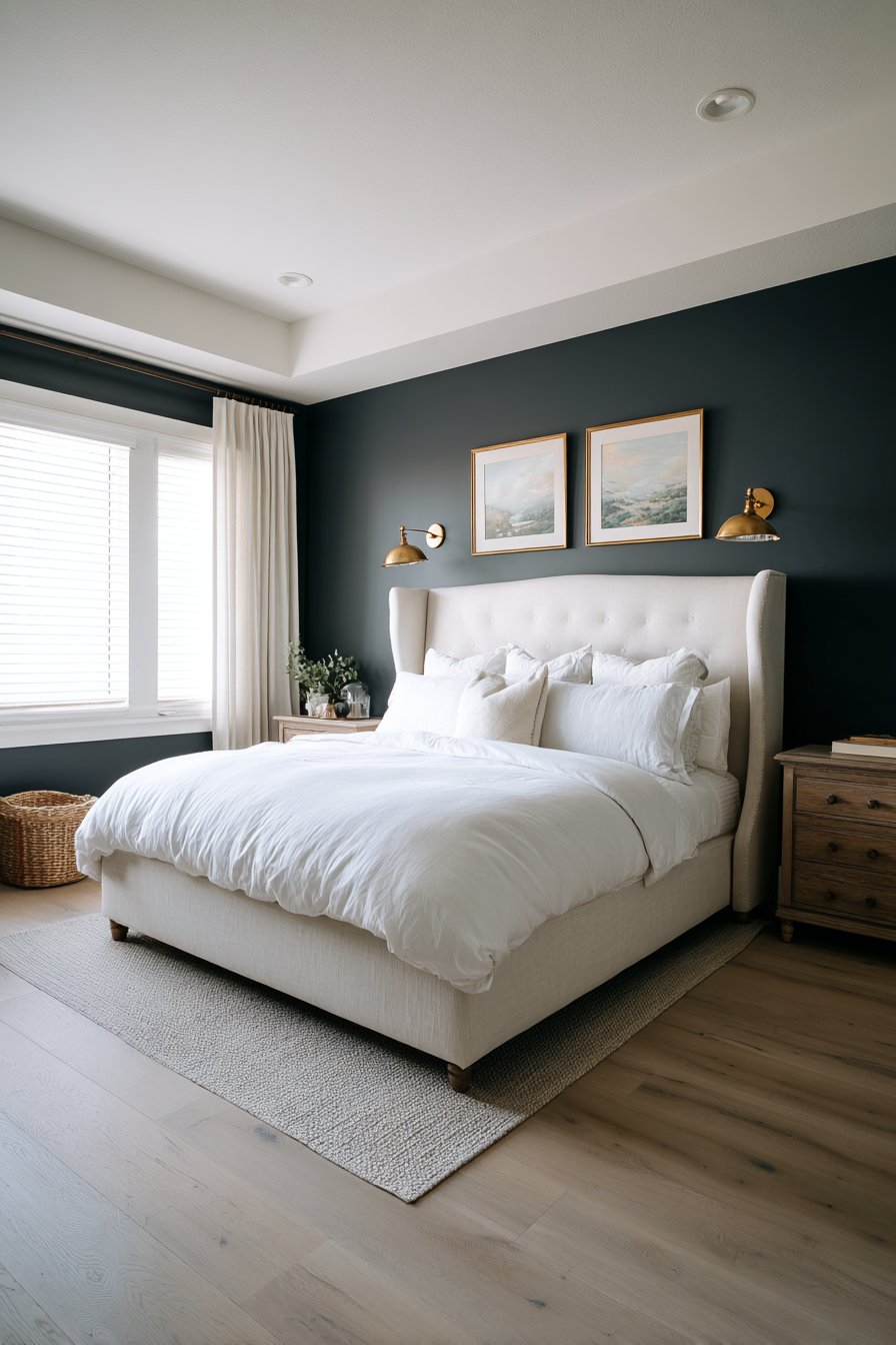 Brass picture lights mounted above artwork on the dark wall provide focused illumination that creates gallery-quality display while adding warm metallic accents. Light oak flooring and white bedding balance the moody wall color, their brightness preventing the dark paint from dominating the entire room. This careful calibration of light and dark elements creates drama without sacrificing the sense of restful calm essential to successful bedroom design.
