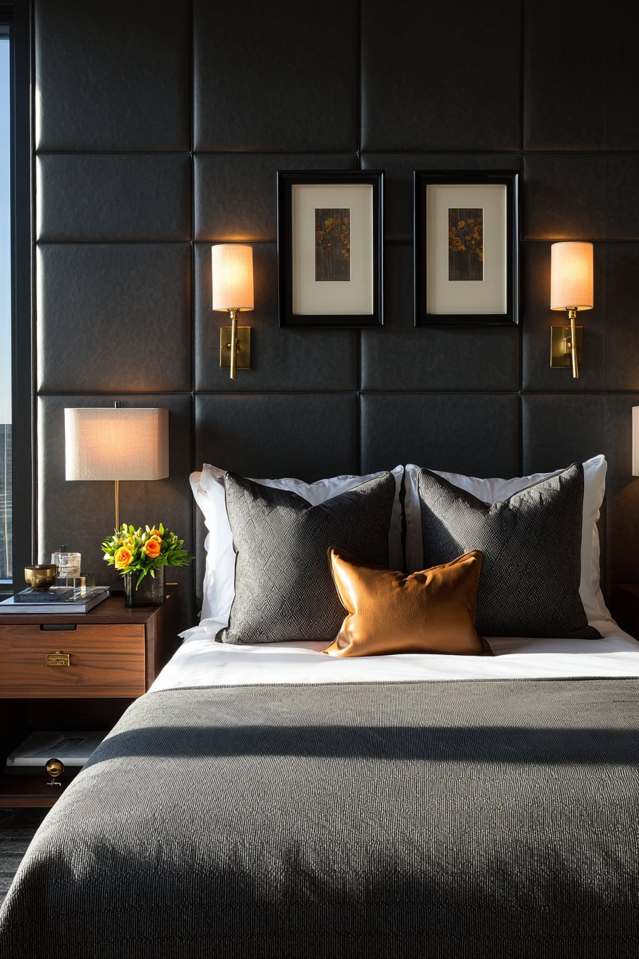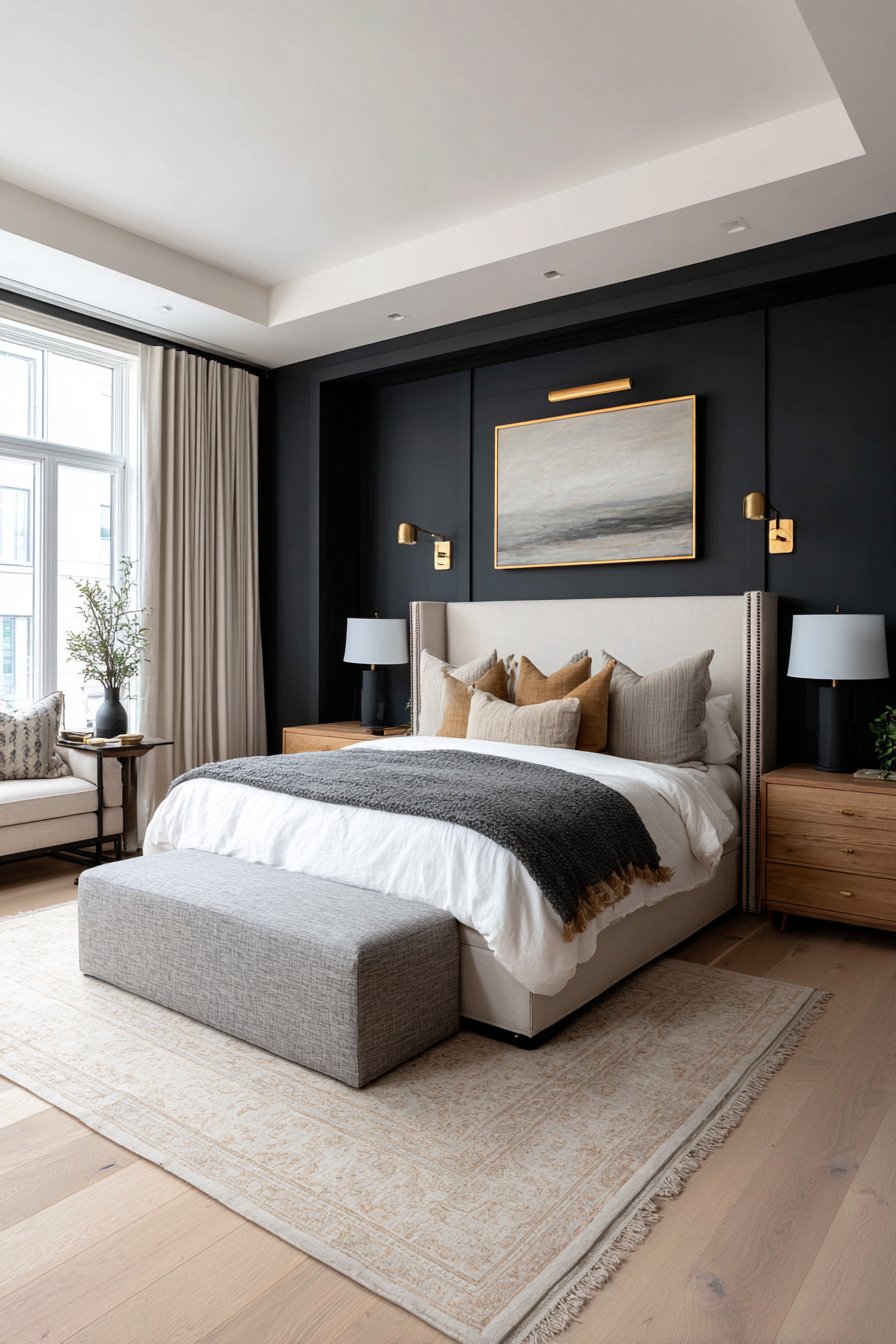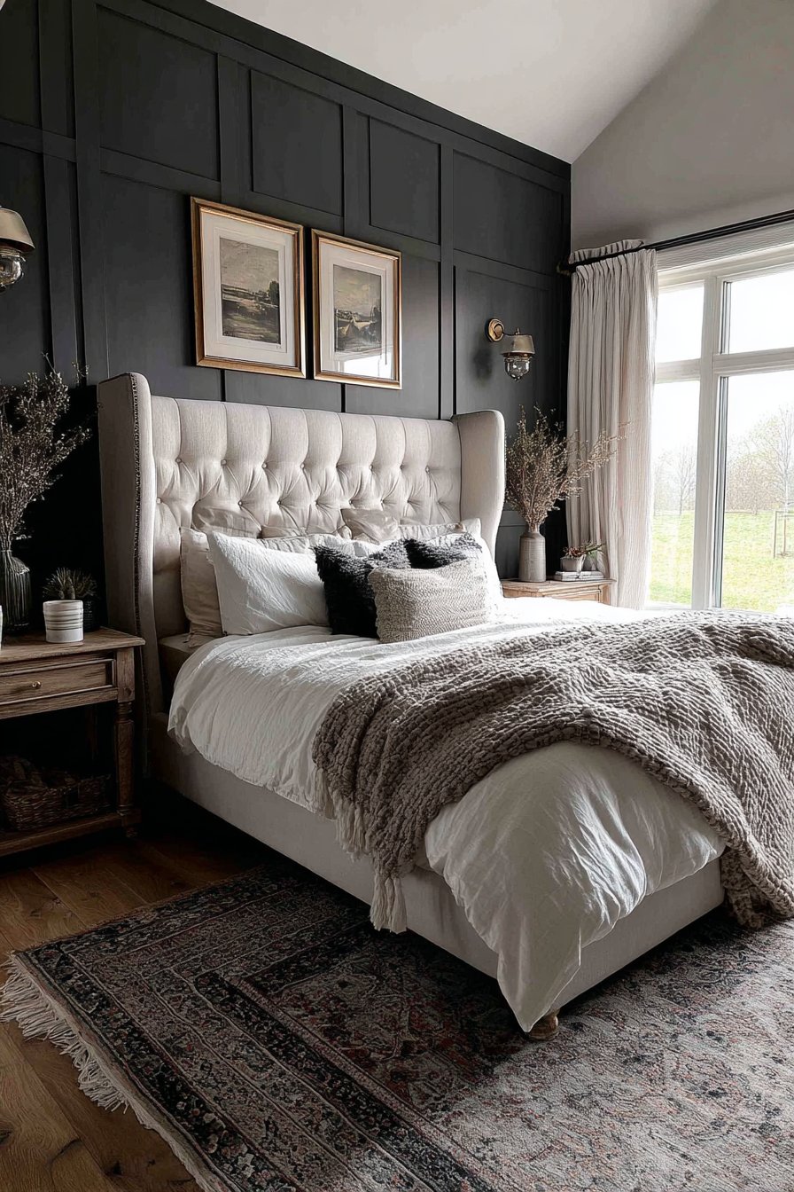 Bedroom wall design ideas create intimate atmosphere through dramatic dark accent wall in deep charcoal paint, serving as backdrop for an upholstered bed with tall wingback headboard in soft cream linen. This installation demonstrates how wall design ideas can use color strategically to create mood and focus attention while white trim maintains brightness and prevents the dark color from feeling oppressive. The dark wall creates a cocoon effect that’s particularly effective in bedrooms where cozy intimacy enhances the room’s primary function.