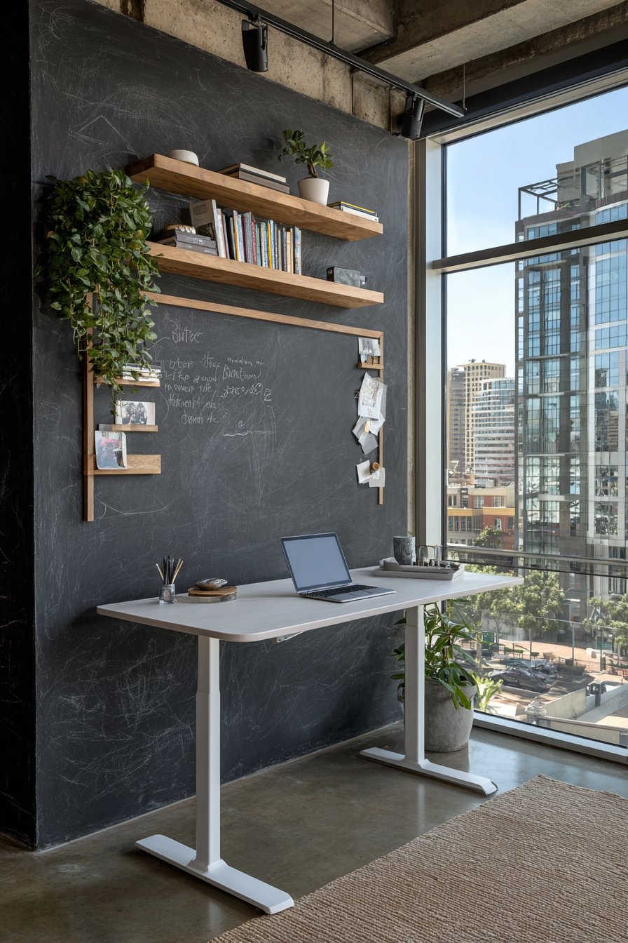 A modern standing desk in white sits in front of the chalkboard wall with minimalist desk accessories, its clean design providing contrast against the dark functional wall. Floating shelves in natural wood flank the chalkboard wall displaying books and plants, their organic warmth preventing the black wall from feeling cold or institutional. The combination of chalkboard surface, magnetic strips, and display shelving creates comprehensive organizational system that keeps workspace functional yet uncluttered.