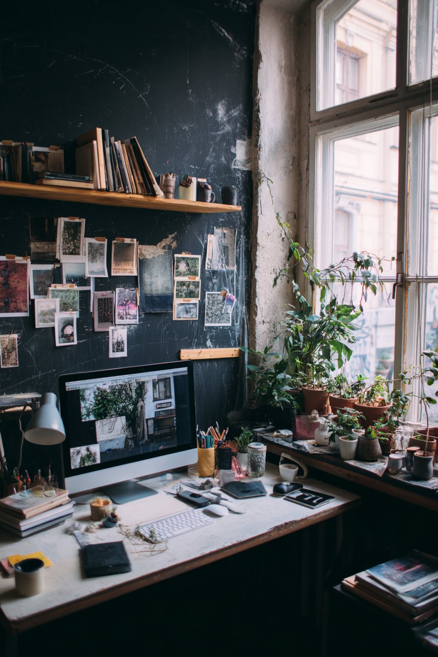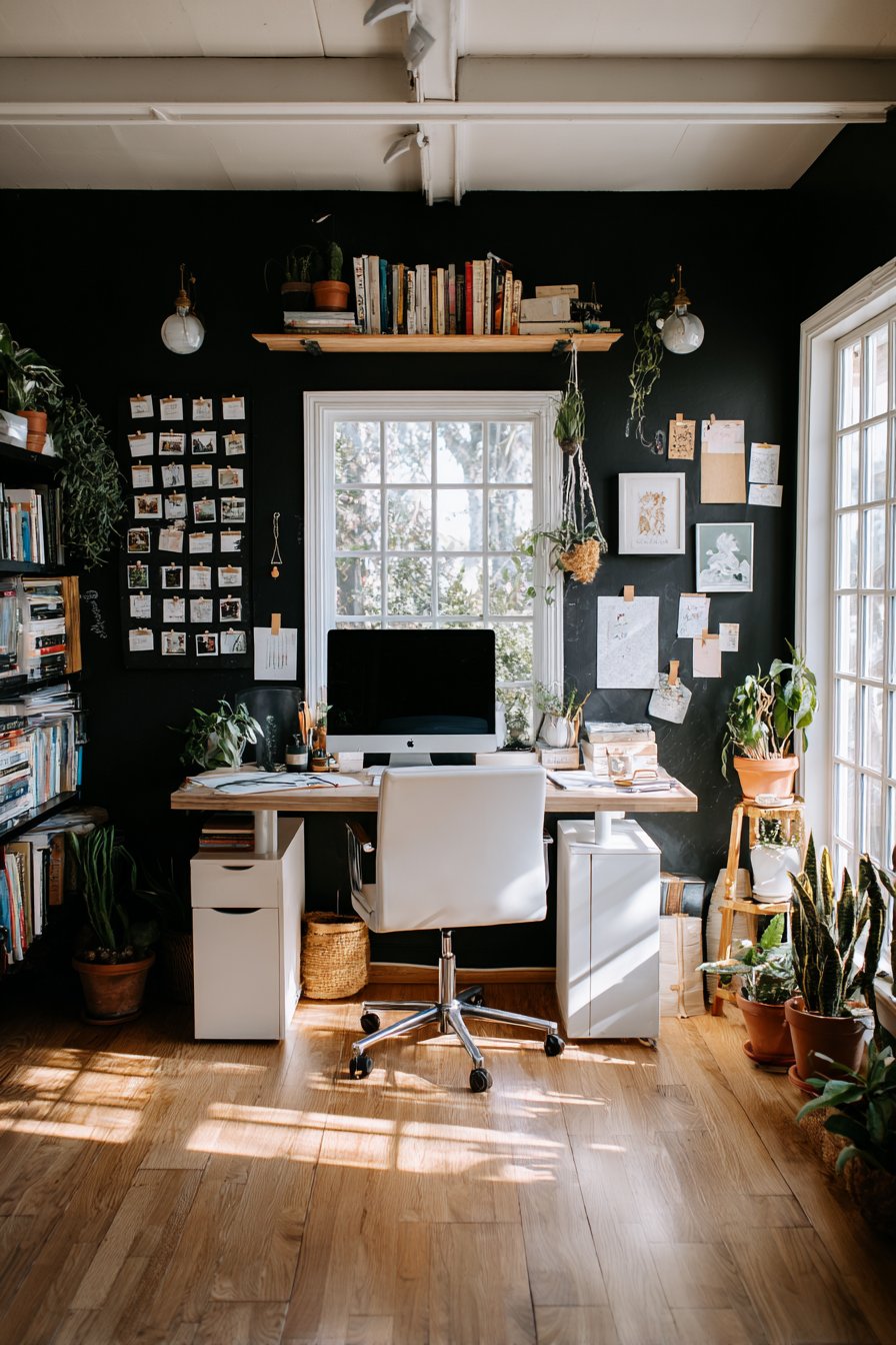 Interior design photography captures the functional creative workspace with balanced lighting showing the matte chalkboard texture and the practical organization system. Natural daylight from large windows ensures the black wall doesn’t overwhelm the space, proving that even dark functional surfaces can work in home offices when balanced with adequate light. This installation demonstrates how wall design ideas can be truly functional rather than purely decorative, supporting work activities while contributing positively to the room’s overall design aesthetic.