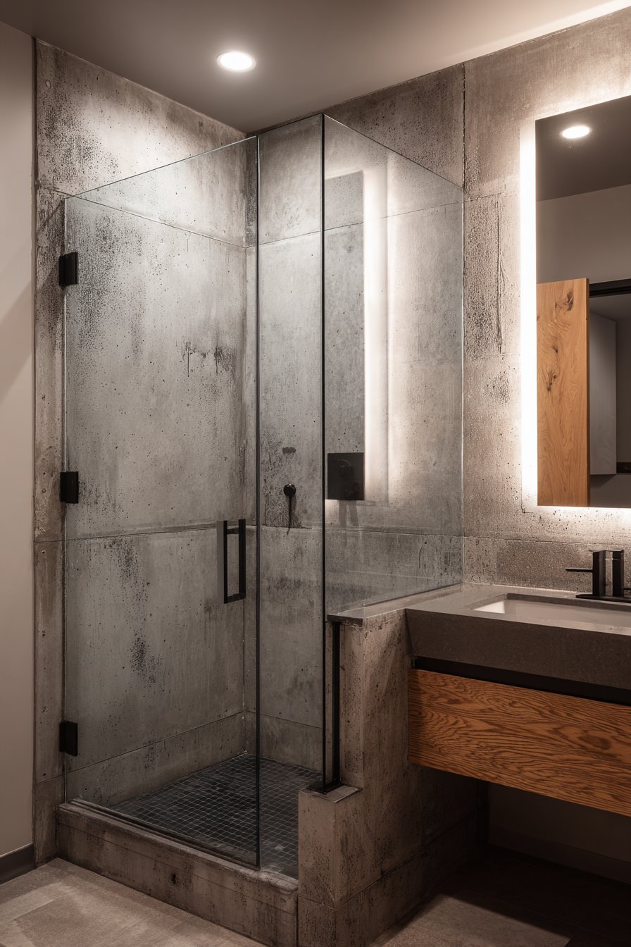 Professional interior photography with balanced exposure captures the concrete texture authenticity and minimal grout lines that make this installation so successful. Soft diffused lighting highlights the surface variations and modern material aesthetic that defines contemporary industrial style. This bathroom proves that wall design ideas can reference utilitarian materials and industrial spaces while still creating comfortable, livable environments suitable for residential applications—the key lies in balancing raw materials with warm elements that humanize the space.