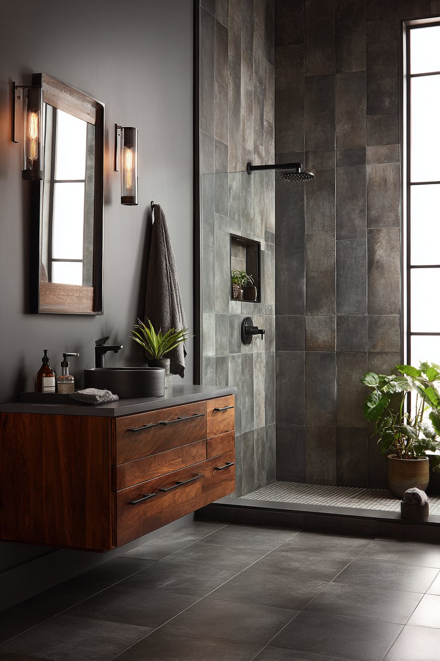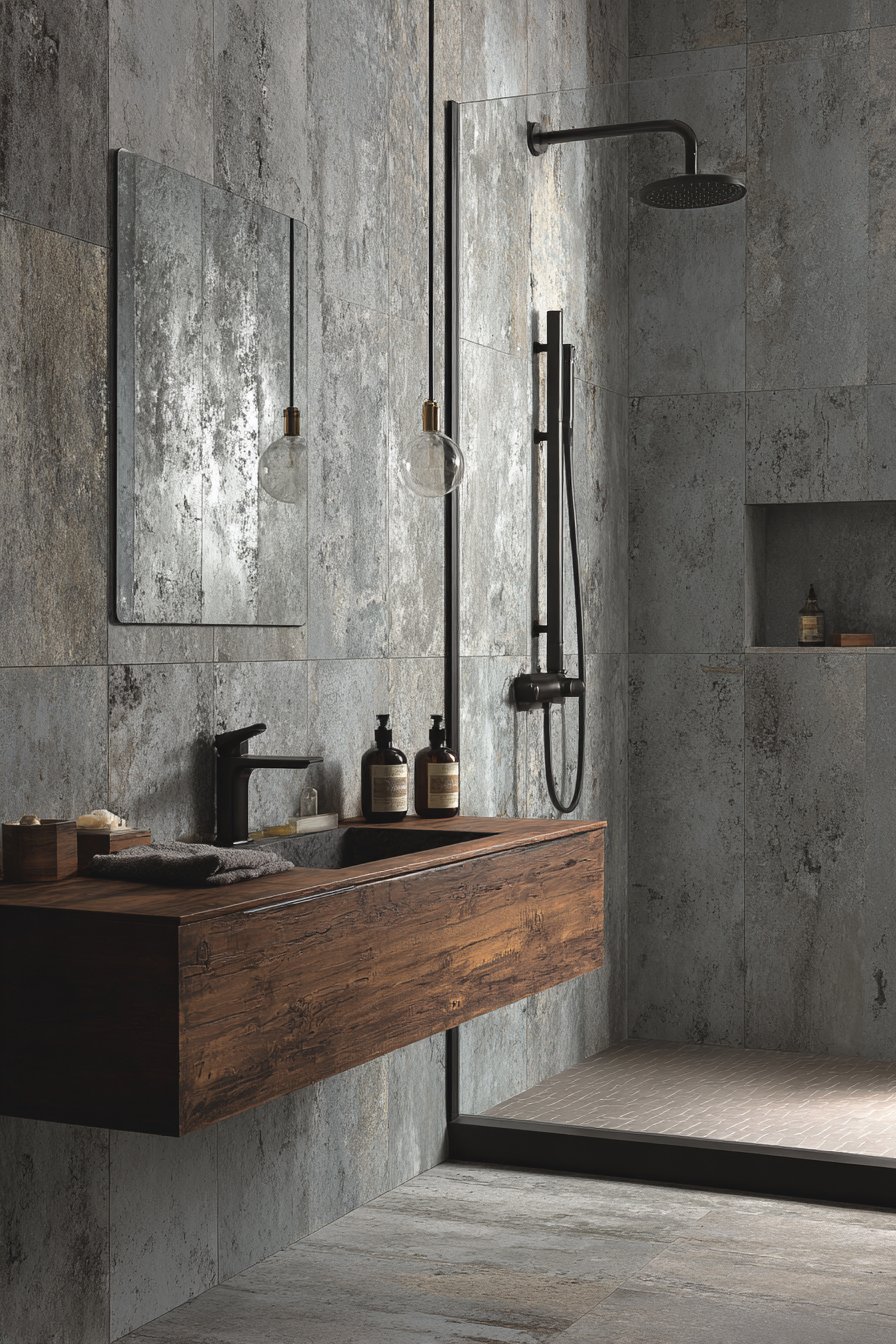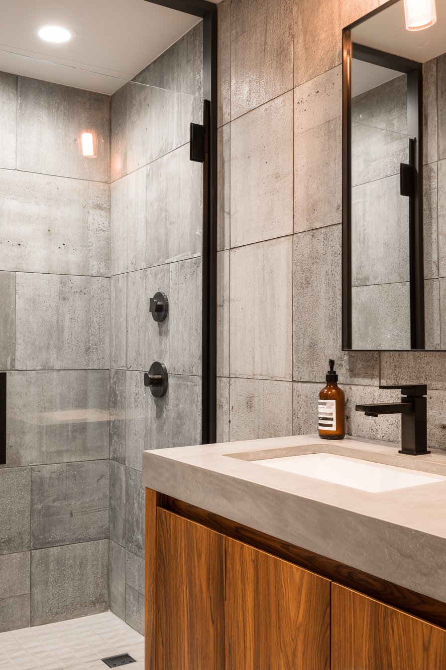 A floating vanity in warm walnut provides essential contrast against the cool gray tile, its rich organic tones preventing the industrial materials from feeling cold or unwelcoming. The combination of concrete-textured tile, black fixtures, and warm wood creates sophisticated material palette that feels both contemporary and timeless. The minimal grout lines possible with large-format tiles enhance the concrete illusion, making the walls appear more like poured concrete than individual tiles.