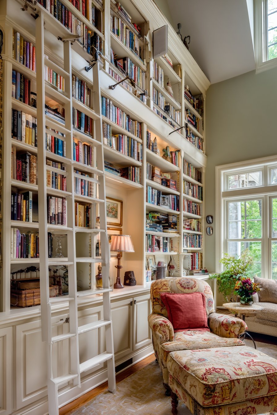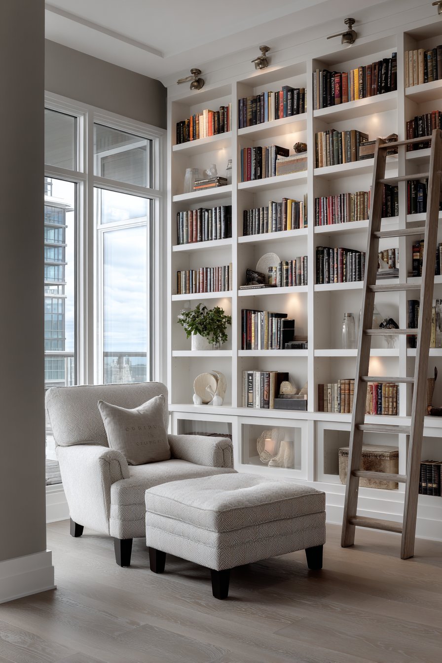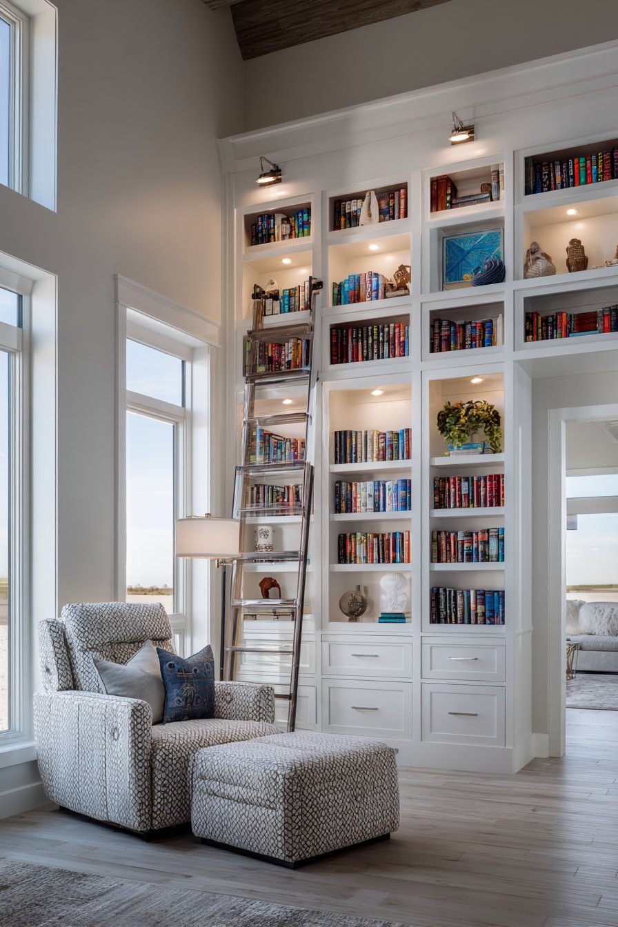 Living room wall design ideas celebrate literary collections through floor-to-ceiling built-in bookshelves in painted white, featuring adjustable shelving filled with color-coordinated books and curated decorative objects. This installation demonstrates how wall design ideas can transform entire walls into functional art that displays personal collections while providing substantial storage. The custom millwork includes integrated ladder hardware for accessing upper shelves and LED puck lighting illuminating each shelf level, details that elevate utilitarian storage into sophisticated architectural feature.