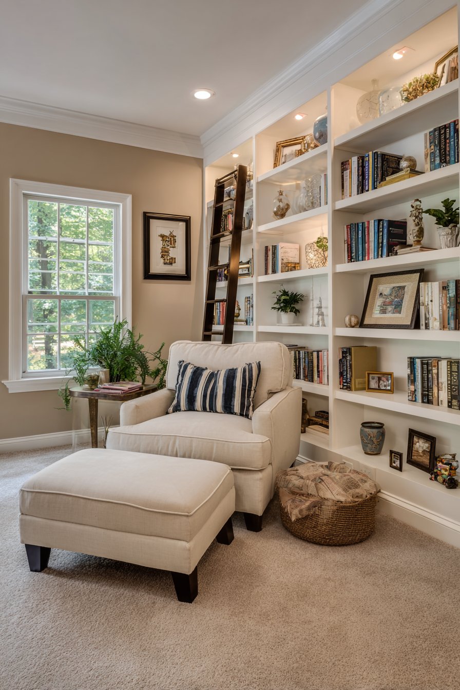 A cozy reading chair and ottoman sit adjacent to the bookshelf wall, creating dedicated reading zone that takes advantage of the book collection’s proximity. The white painted finish keeps the substantial built-in from overwhelming the room, reflecting light and maintaining open feeling despite the wall-to-wall coverage. The adjustable shelving provides flexibility to accommodate books of varying heights alongside decorative objects, creating varied display that prevents monotonous appearance.