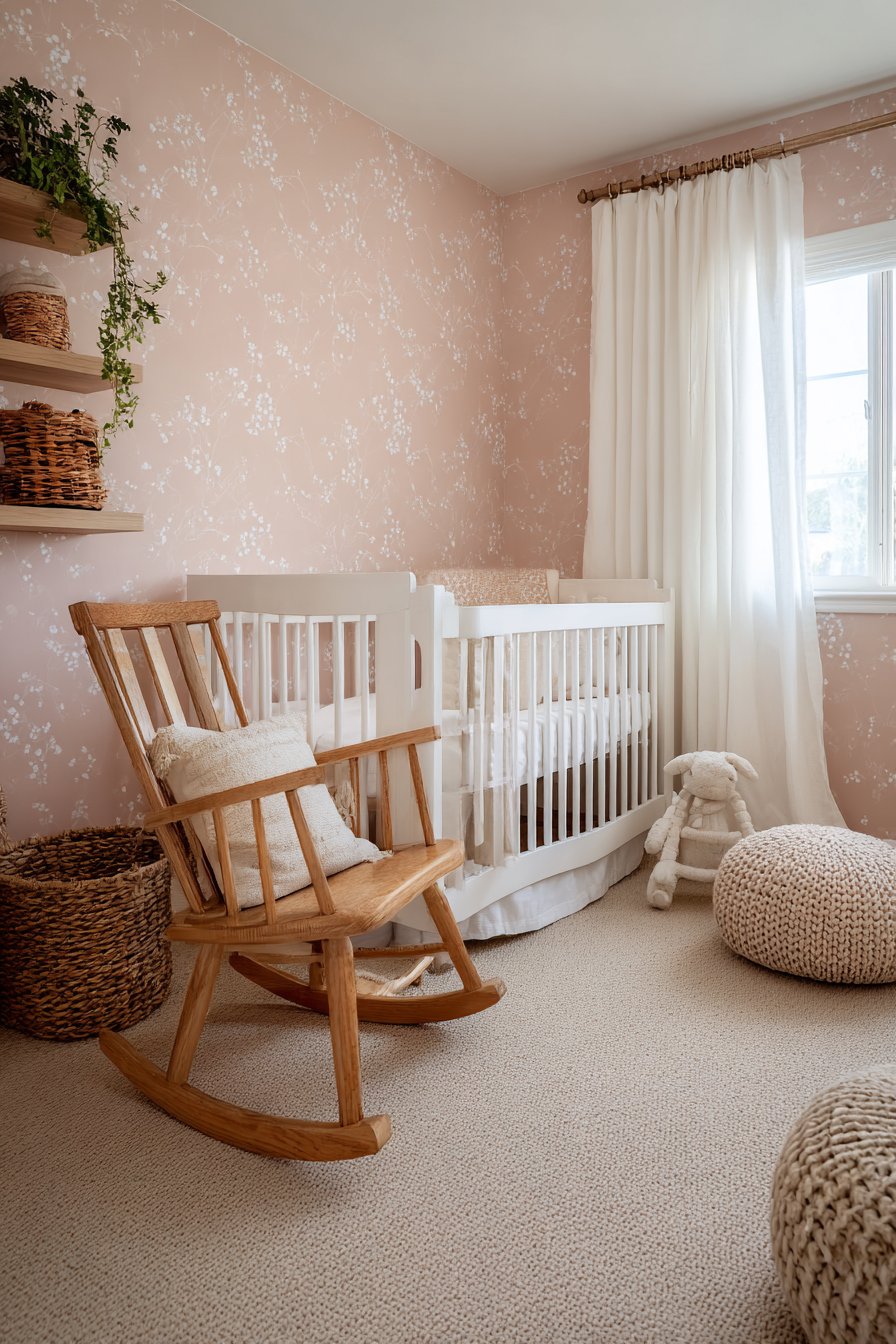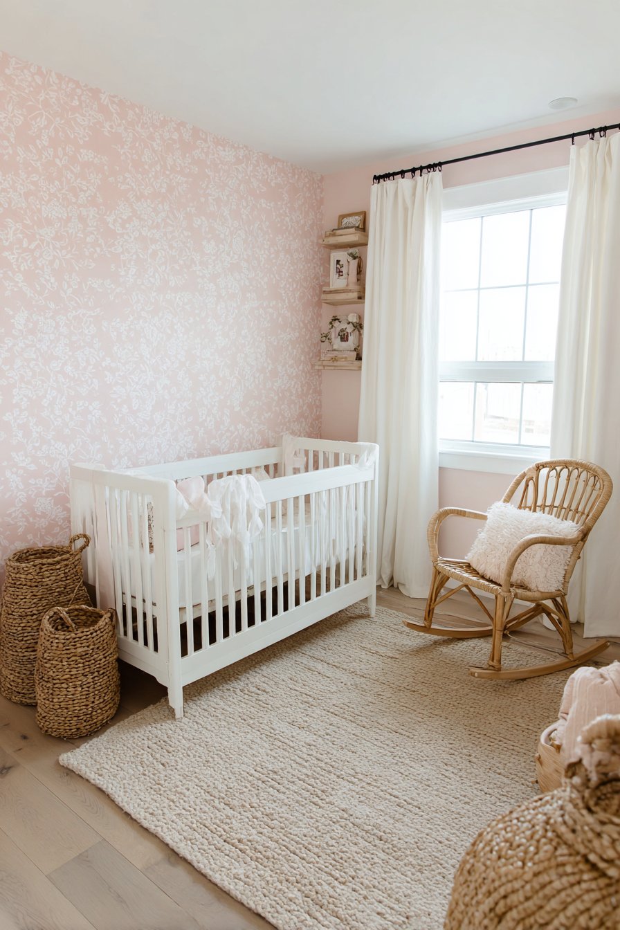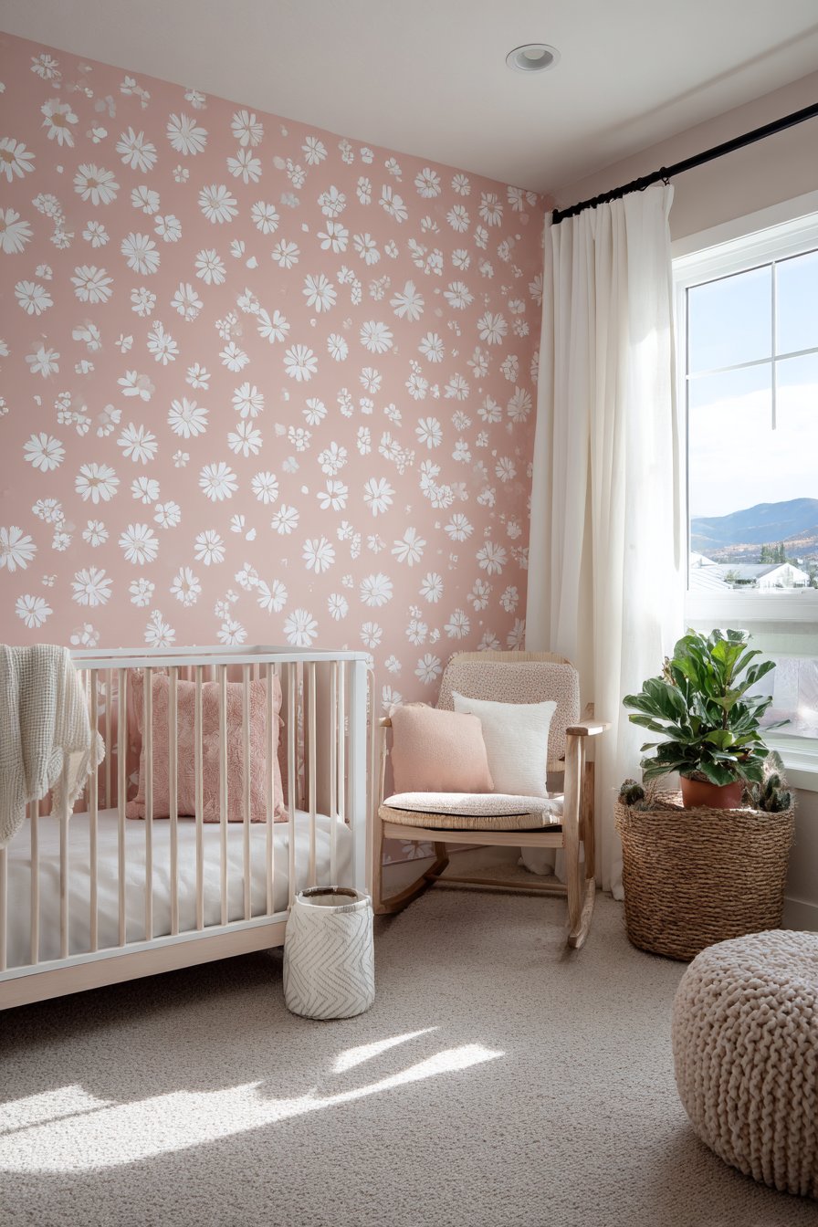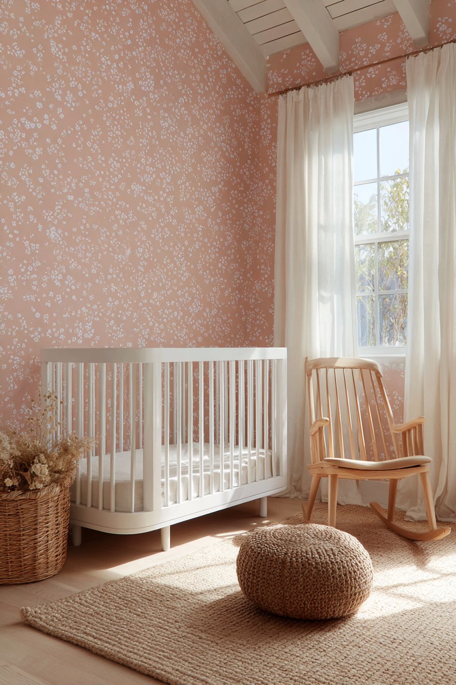 Interior photography captures the wallpaper pattern detail and soft pink coloration with natural daylight, showing how the delicate floral design creates interest without overwhelming. Wide-angle perspective demonstrates how the patterned wall integrates with neutral furnishings, serving as beautiful backdrop that doesn’t compete with the room’s functional elements. Balanced exposure prevents the pink from appearing oversaturated, showing the true soft, subtle coloring that makes this pattern appropriate for a serene nursery environment.