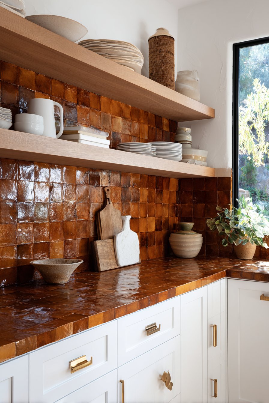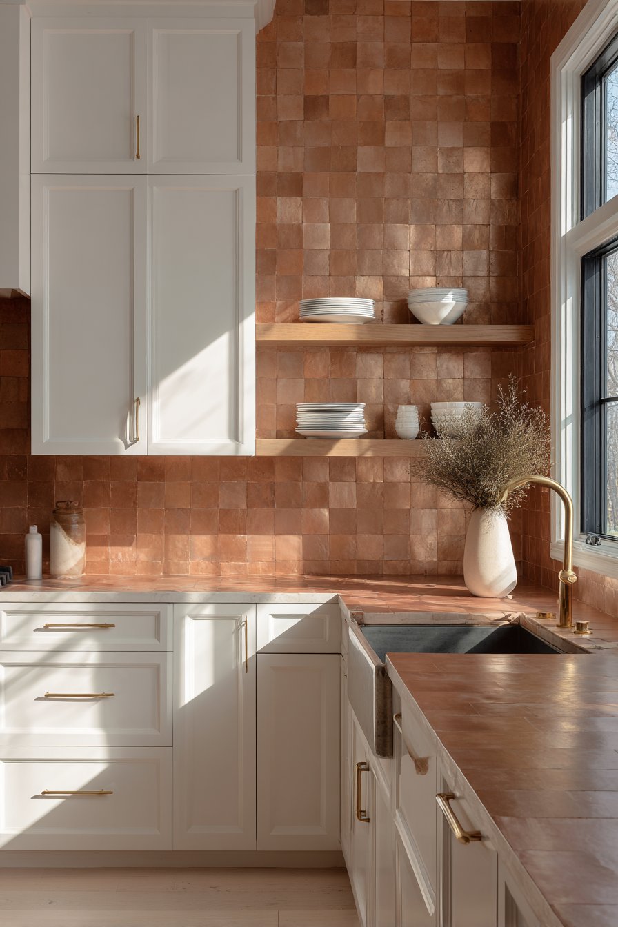 White shaker cabinets and brass hardware complement the warm terracotta tones, creating classic color combination that feels fresh and timeless. Open shelving displays white dishes creating visual breathing room and functional display that breaks up the tile expanse. The handmade quality of zellige tiles means each piece is slightly different in color saturation and surface texture, creating overall effect that’s cohesive yet unique—no two installations look exactly alike.
