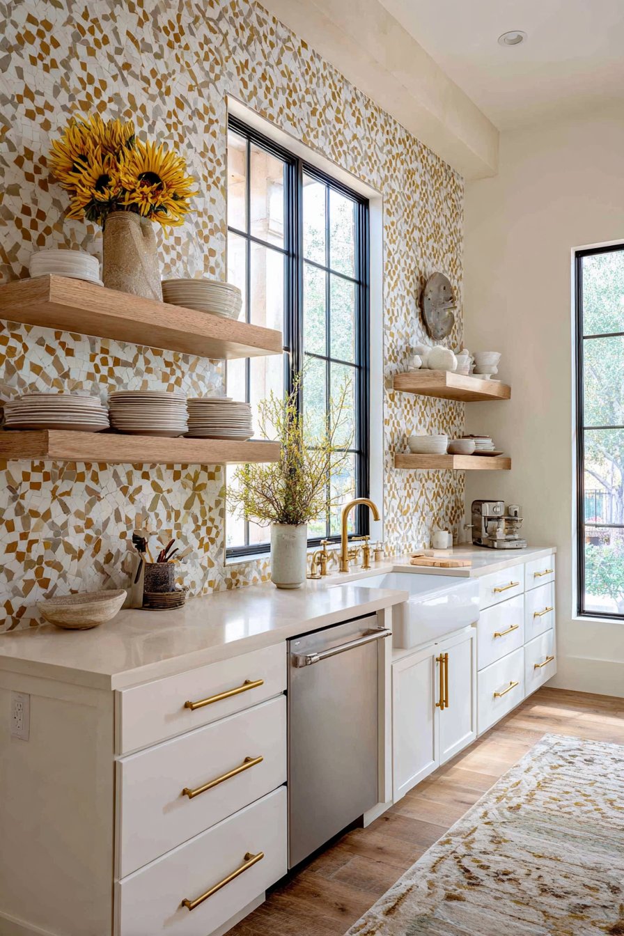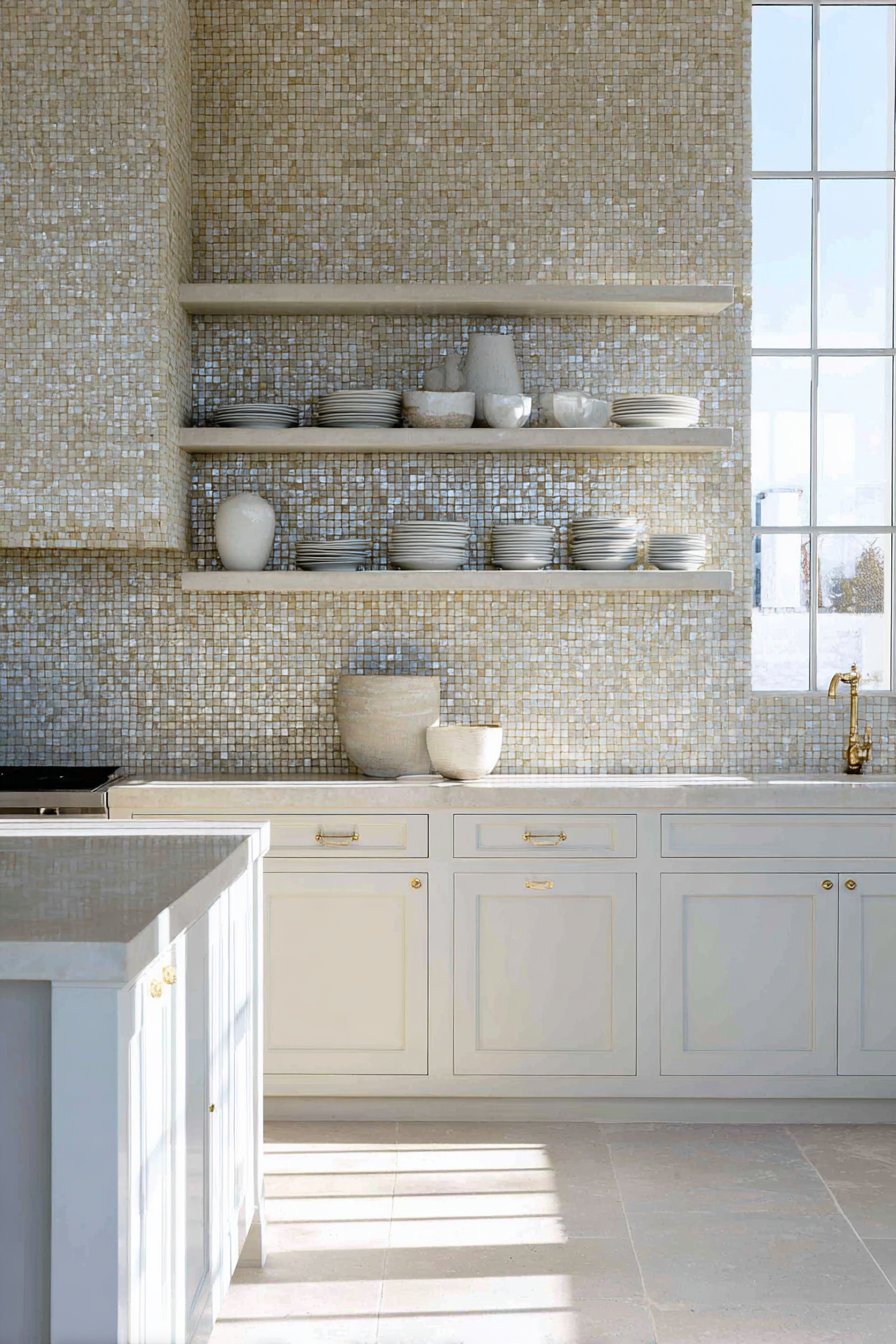 Professional interior photography with natural window light captures the tile color variations and glossy surface reflections that give zellige its distinctive character. Detail focus shows the handmade texture and subtle irregularities that add authentic charm impossible to replicate with perfectly uniform manufactured tiles. This kitchen proves that wall design ideas incorporating traditional handmade materials can feel completely contemporary when paired with modern cabinetry and fixtures, bridging old-world craftsmanship with current design sensibilities.